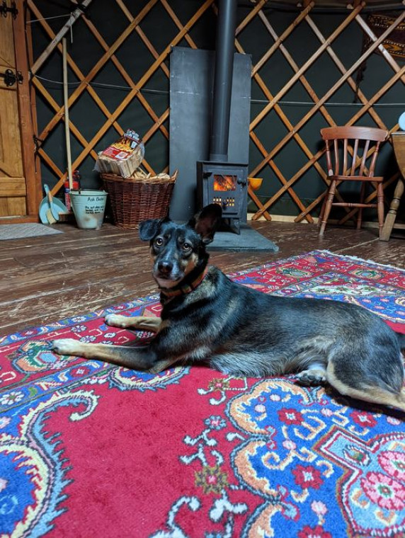Black Isle Yurts have a few different yurts to choose from, the majority dogs can stay in. Utah is loving laying on the rug in front of the fire.