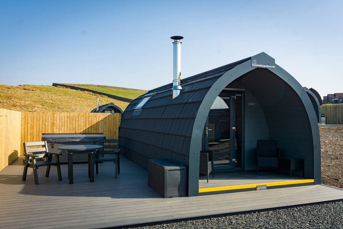 Herding Hill Farm is open all year round. As well as tourers and campers we have a range of glamping pods to suit all budgets, from our Wigwam cabins, some of which have en-suite toilet and hot tub through to our adult-only luxury Castle Pods which have everything you need for the most amazing of glamping experiences including fire pits, BBQ, amazing views and private outdoor hot tub. We have dog friendly accommodation in all types of glamping pod. Luxury Lodge with 3 bedrooms and outdoor hot tub.