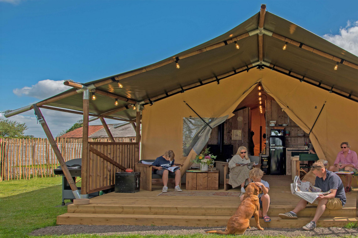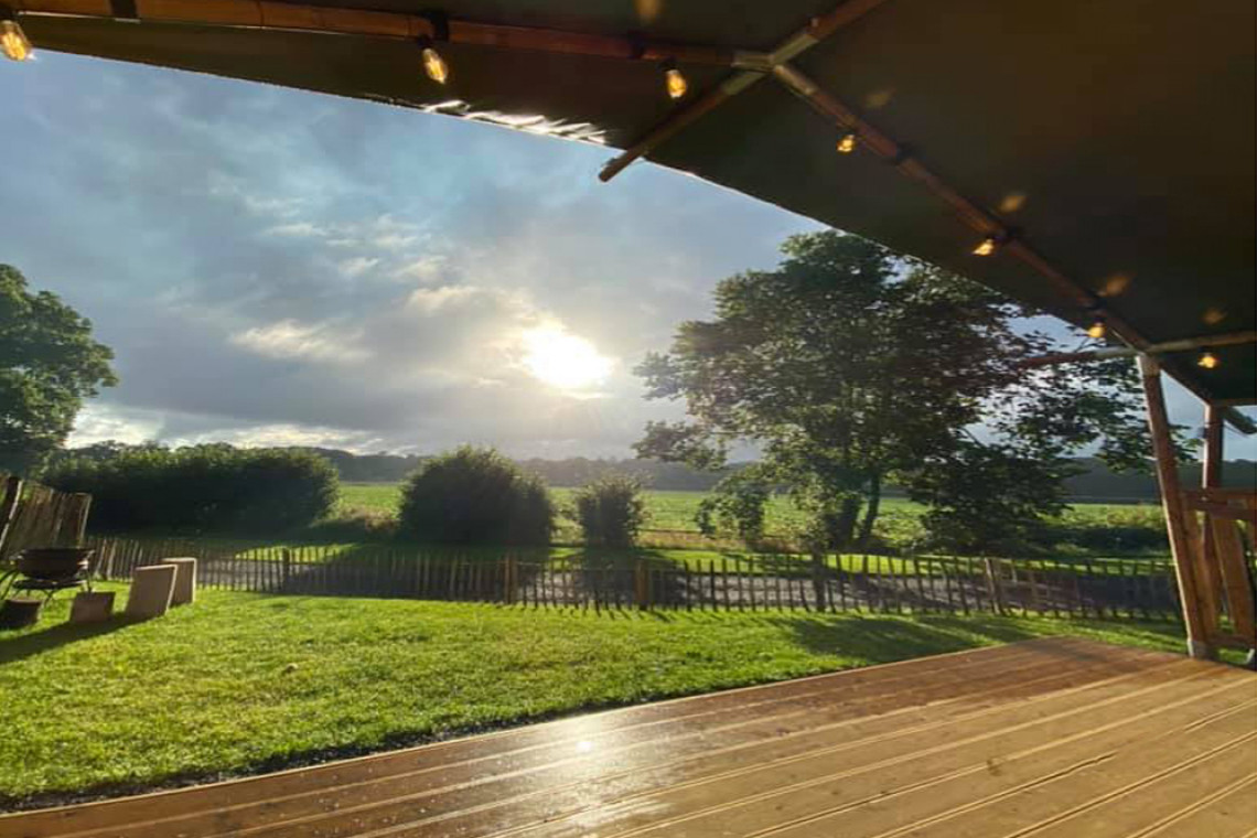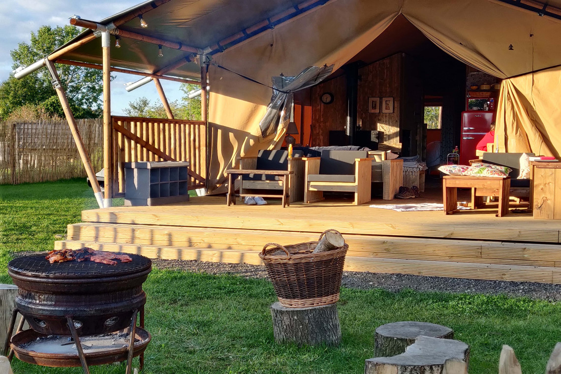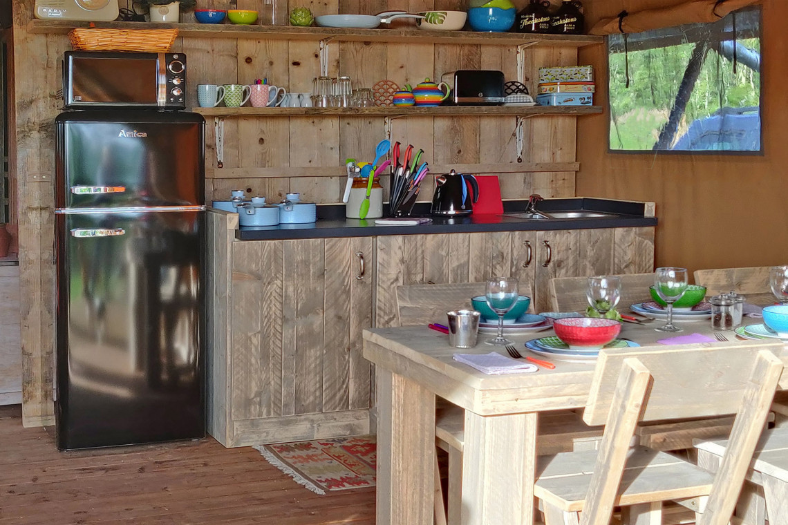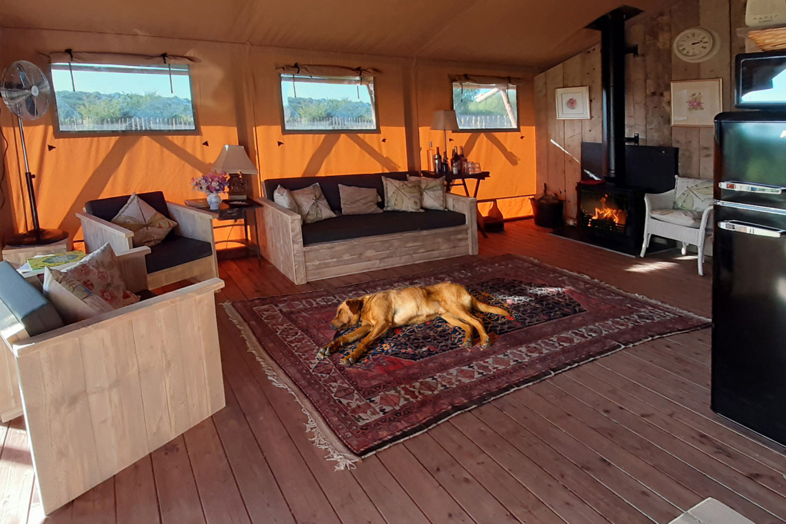 Our super luxurious Safari Tents feature a large log burner, kingsize beds, luxury bed linen and feather down duvets, electric blankets, WiFi and wide-screen smart TV, a solid wooden structure for the full-size bathroom with a luxury rainfall shower, a wooden structure for the bedrooms, fully equipped solid wooden kitchen with large fridge/freezer, induction hob etcetera. Comfy sofas and furniture indoors and outdoors, large terrace and enclosed garden (grass) with firepit and gas-bbq.