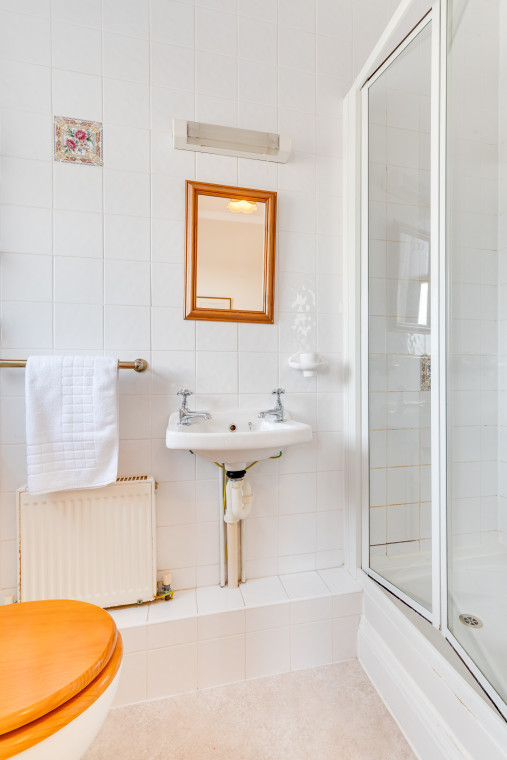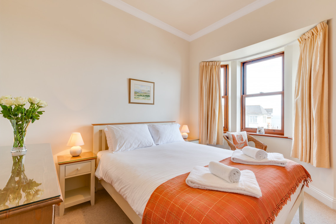 The open plan kitchen and dining room lends itself to family dining, while the cosy sitting room has seasonal views of the sea. Both bedrooms and bathrooms are on the first floor; double bedroom with en-suite shower room seasonal sea views. Across the hallway is the twin bedroom with family bathroom adjacent.