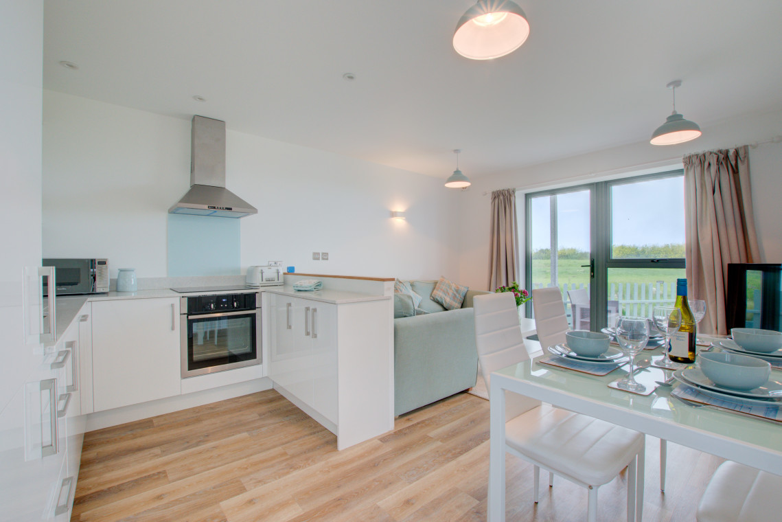 5 Ocean Reach is a semi-detached property set within Bolberry Down, providing excellent sea views and on-site restaurant. The property features two bedrooms and two bathrooms, the perfect holiday home for couples or families. On the ground floor is an excellent and well-equipped open-plan kitchen, dining and living room. From here opens out to a small patio and lawn with Rattan dining chairs for two and sofa with coffee table. There is also a ground floor shower-room with W.C. Stairs lead up to the first floor, where you will find the family bathroom, with both a bath and separate shower, double bedroom with private balcony and twin bedroom. 5 Ocean Reach sits on the South West Coastal Path, providing some of the most beautiful walks in this part of the South Hams. The popular coastal town of Salcombe is only four miles away and Hope Cove is only 20 minutes on foot.