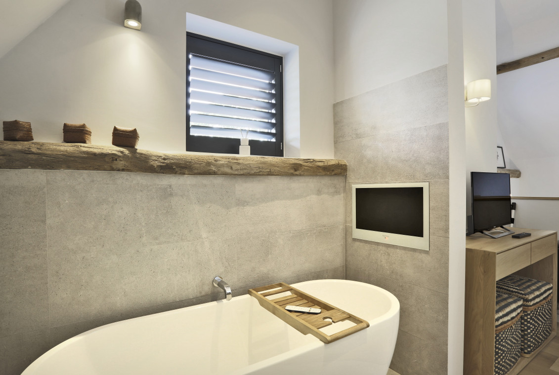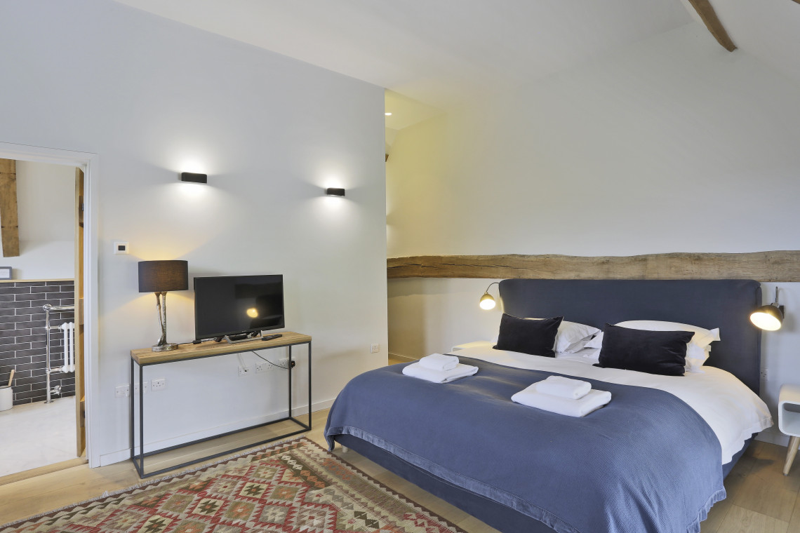 Bedroom 4: super king bed, bedside tables, lamps, TV, chest of drawers, wardrobe and dressing area, wooden floors, rugs, ensuite bathroom with freestanding bath with TV adjacent, WC, hand basin, shaver point and shower cubicle.
