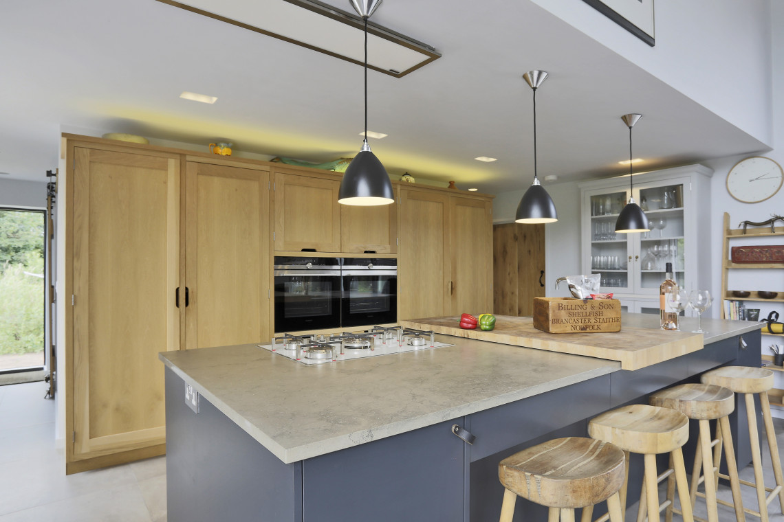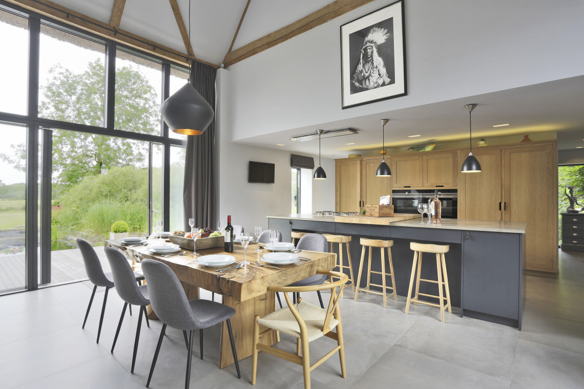 Living area - sitting, dining and kitchen areas: two floor to ceiling windows, hand built kitchen, beautiful furniture and tiled floor throughout. Two 3 seater leather sofas, armchair and footstool, coffee table, integrated woodburner (one basket of logs and kindling provided on arrival), dining table with seating for up to 10 guests. Solid wood kitchen with two ovens, dishwasher, gas hob, large fridge freezer, instant boiling water tap.
