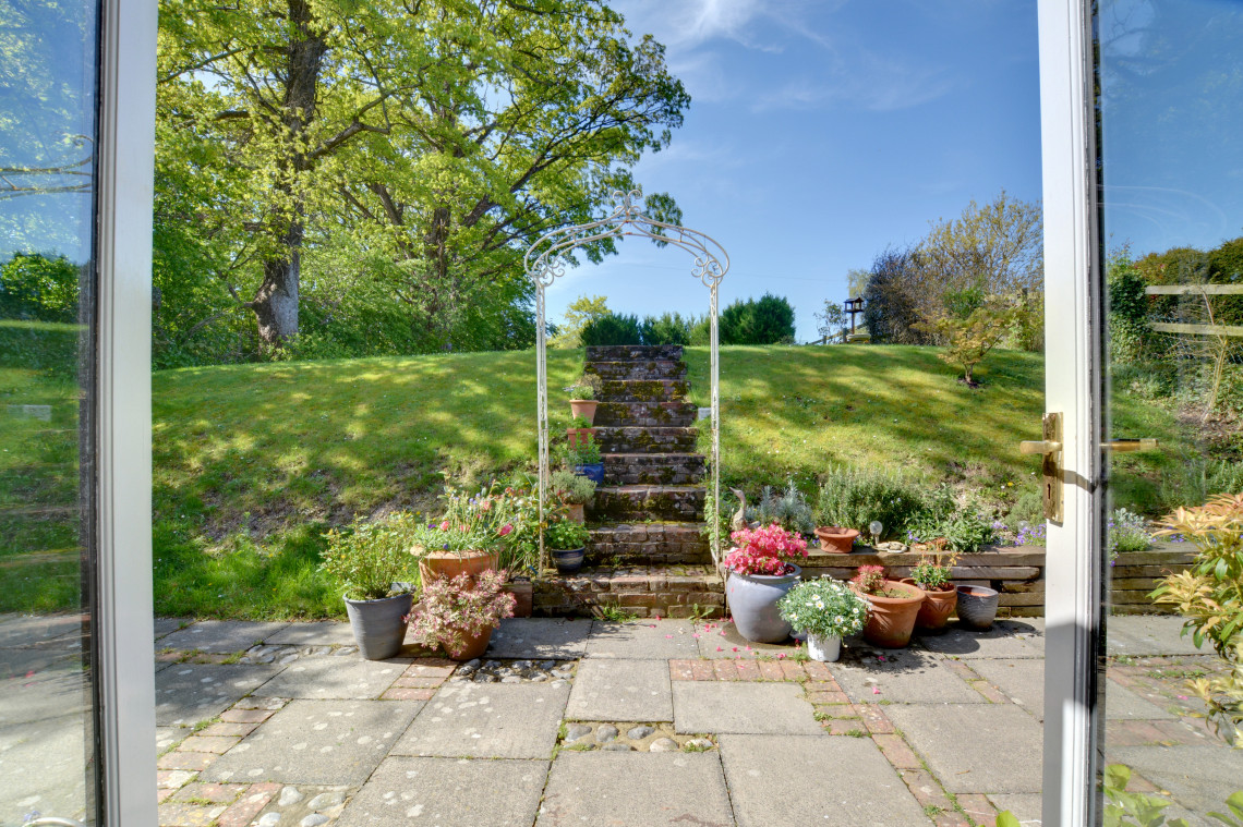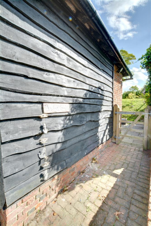 Outdoor: Brick paved courtyard to front of house.  Large paved terrace with garden furniture and barbecue to rear of house  with steps up to large lawned and enclosed garden