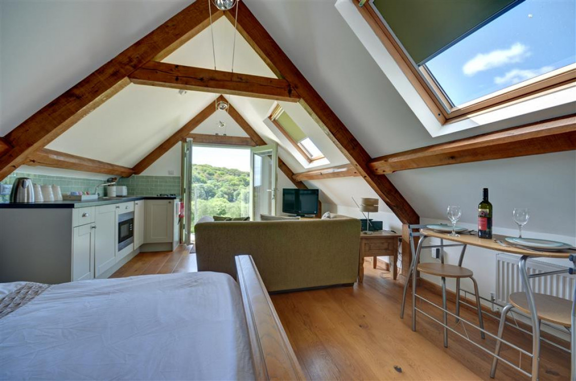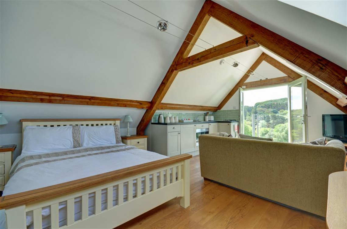 Stunning one bedroom timber clad studio apartment overlooking the countryside just five miles from the maritime port of Falmouth. Cosy living room with gas central heating and a sunny lawned garden. The owner's friendly small dog Bella roams freely at times and may well pay you a visit.