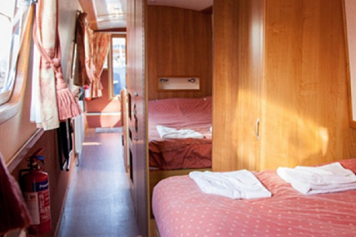 The saloon has seating which can be used as a double bed, if required. Colour flat screen TV/DVD player, Freeview with USB charging point, radio/CD player. A fully equipped galley with a four-ring cooker, oven and grill. Electric fridge with freezer compartment. Cutlery, crockery, saucepans and cooking utensils are provided. Sleeping is in two cabins, all with flexible layouts. Double beds measure 6ft 3in x 4ft with interior sprung mattresses. Single beds measure 6ft 3in x 2ft with interior sprung mattresses. There are two bathrooms, each offering a full size shower.