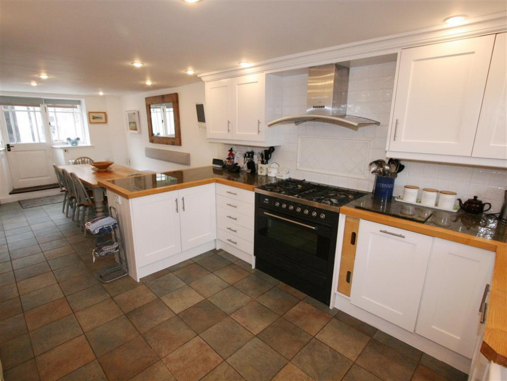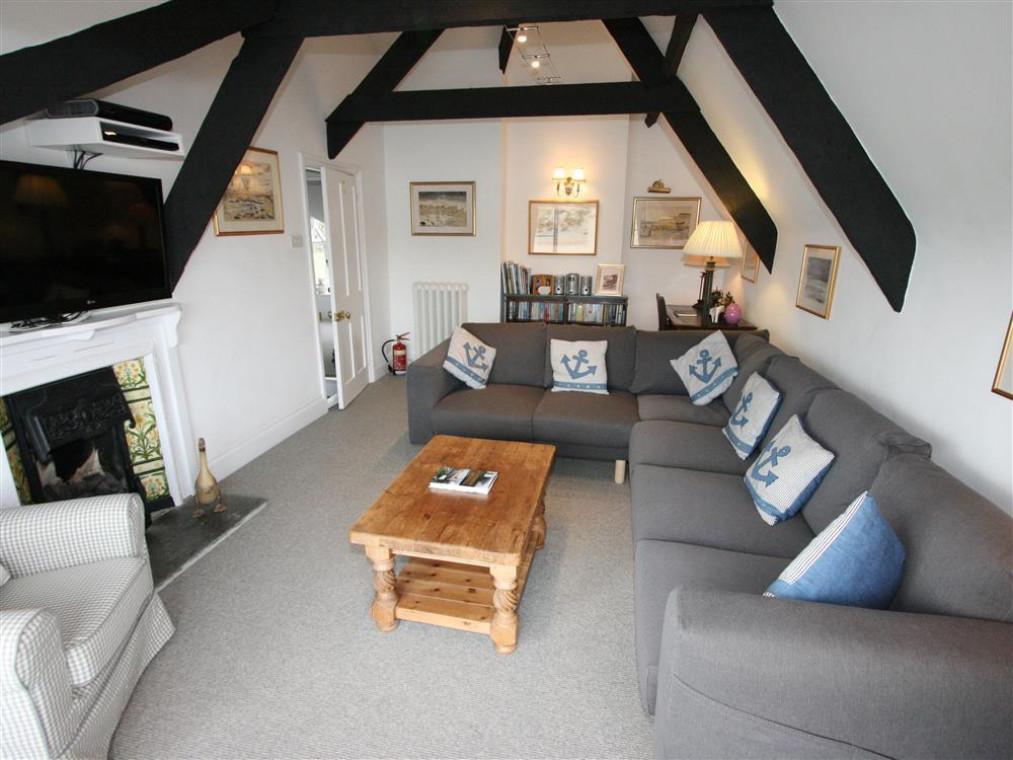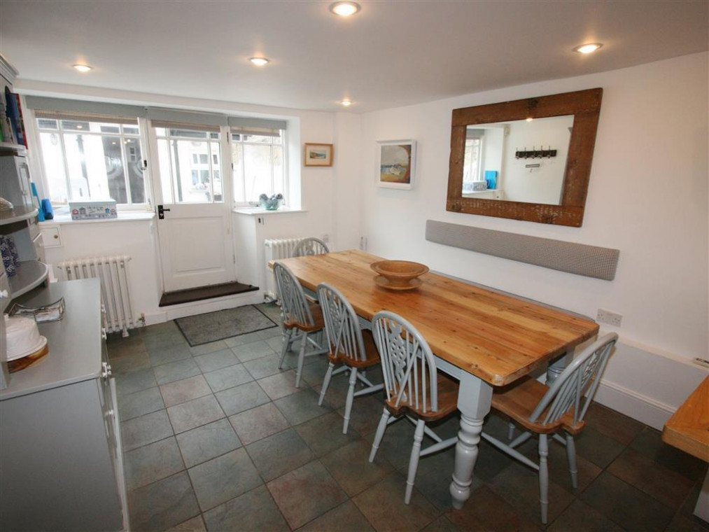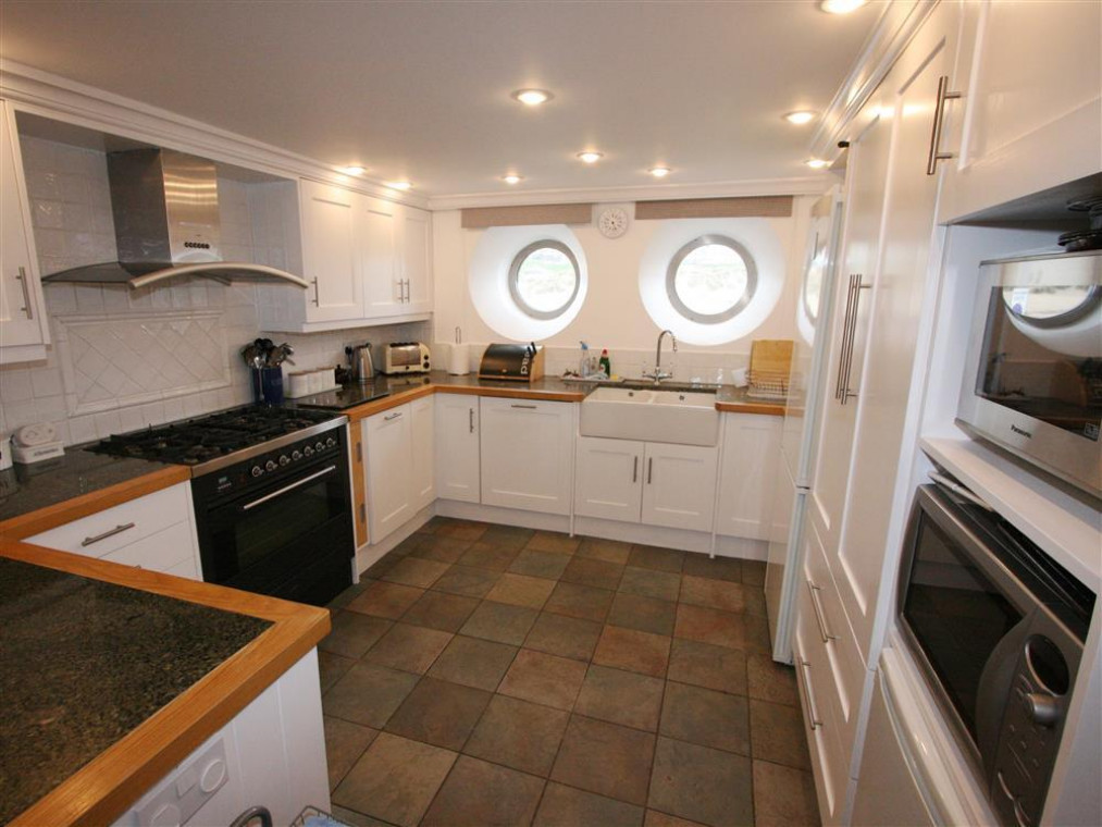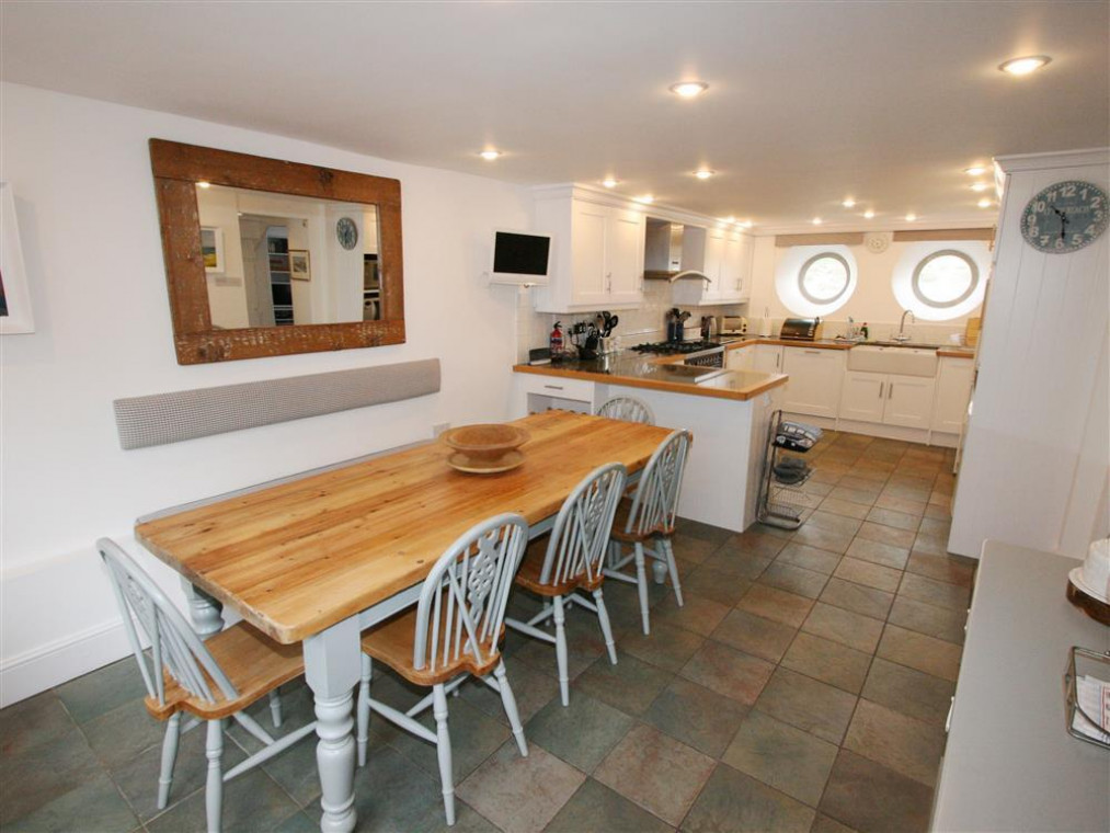 The gated parking area is large enough for two good sized cars and gives the option of entering the cottage by the front door or, as most people choose, through the breakfast/dining area with table and seating for ten and open plan kitchen with high quality fittings and unusual dual porthole windows overlooking Bude Canal. This area leads to the ground floor sitting room with two sofas, fireplace and bay window to the canal.
