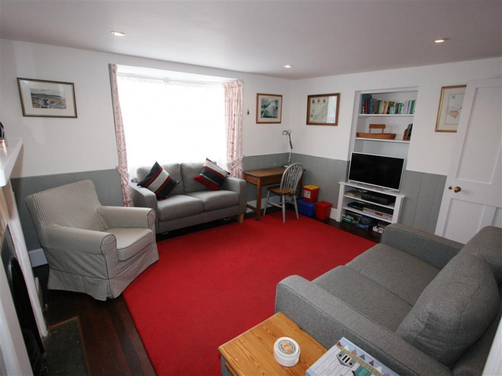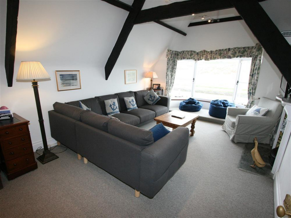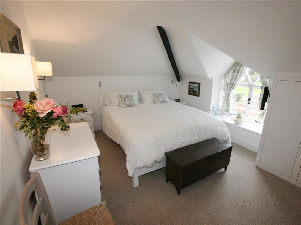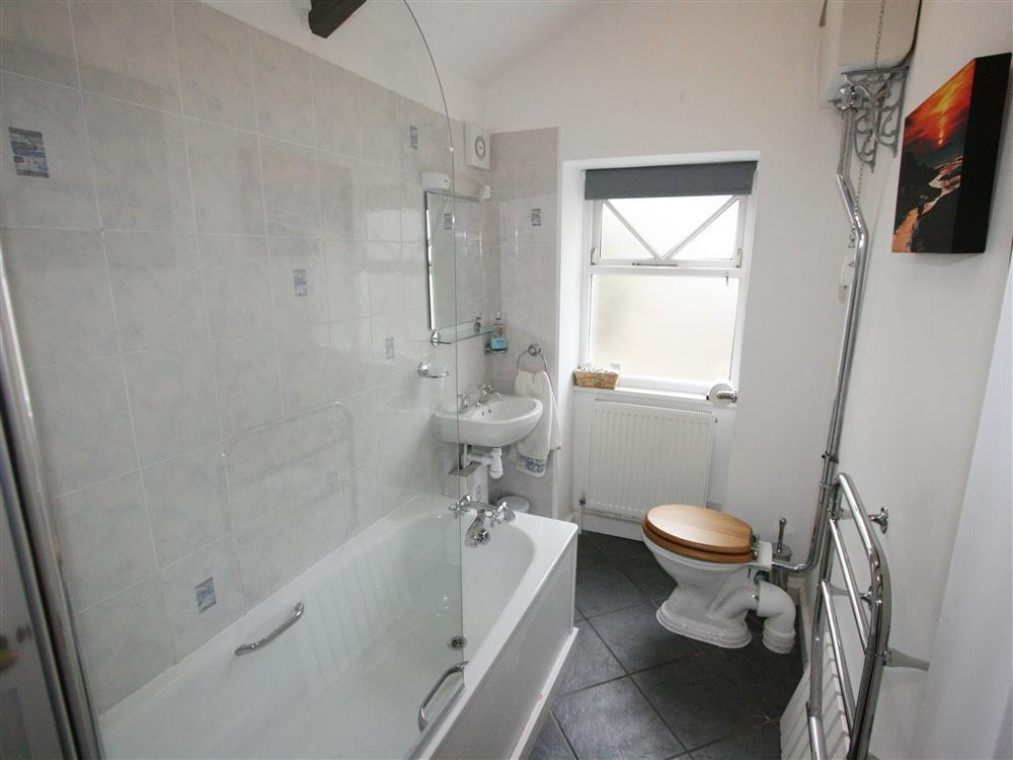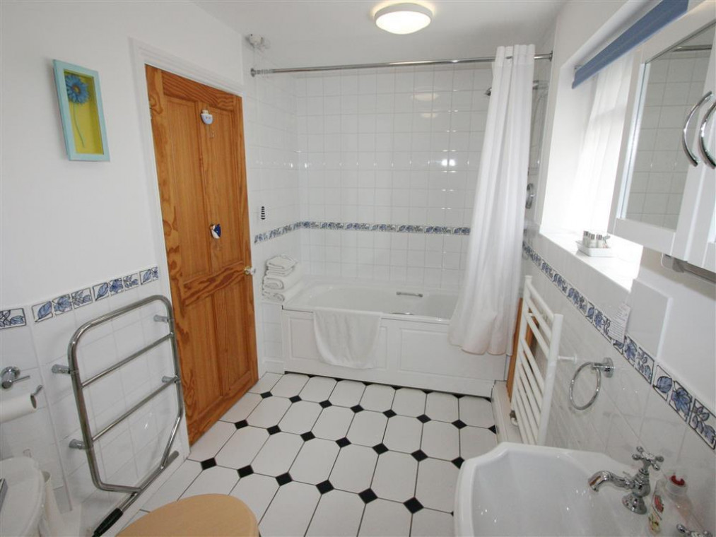 Upstairs the feature is the sitting room with bay window facing the beach and sea which seems almost in line with the water when the tides are at their highest. The master bedroom faces the garden and has a 5ft 6in king size bed and an en-suite bathroom WC with power shower over the roll-top bath and wash basin. There is also a comfortable twin bedroom facing the canal and beach.