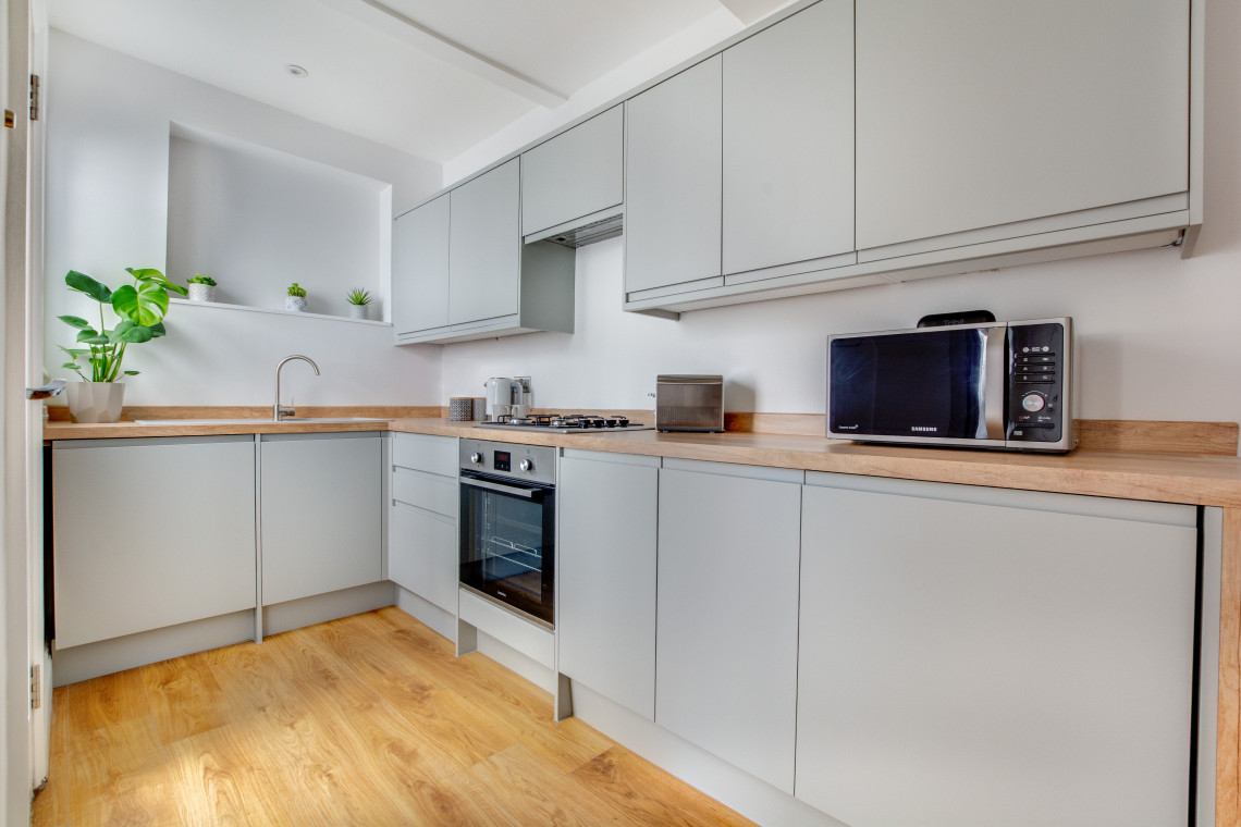 Kitchen & utilities: gas oven and hob, microwave, toaster, kettle, fridge with icebox