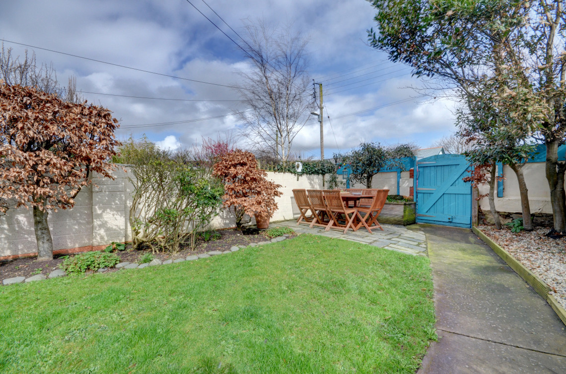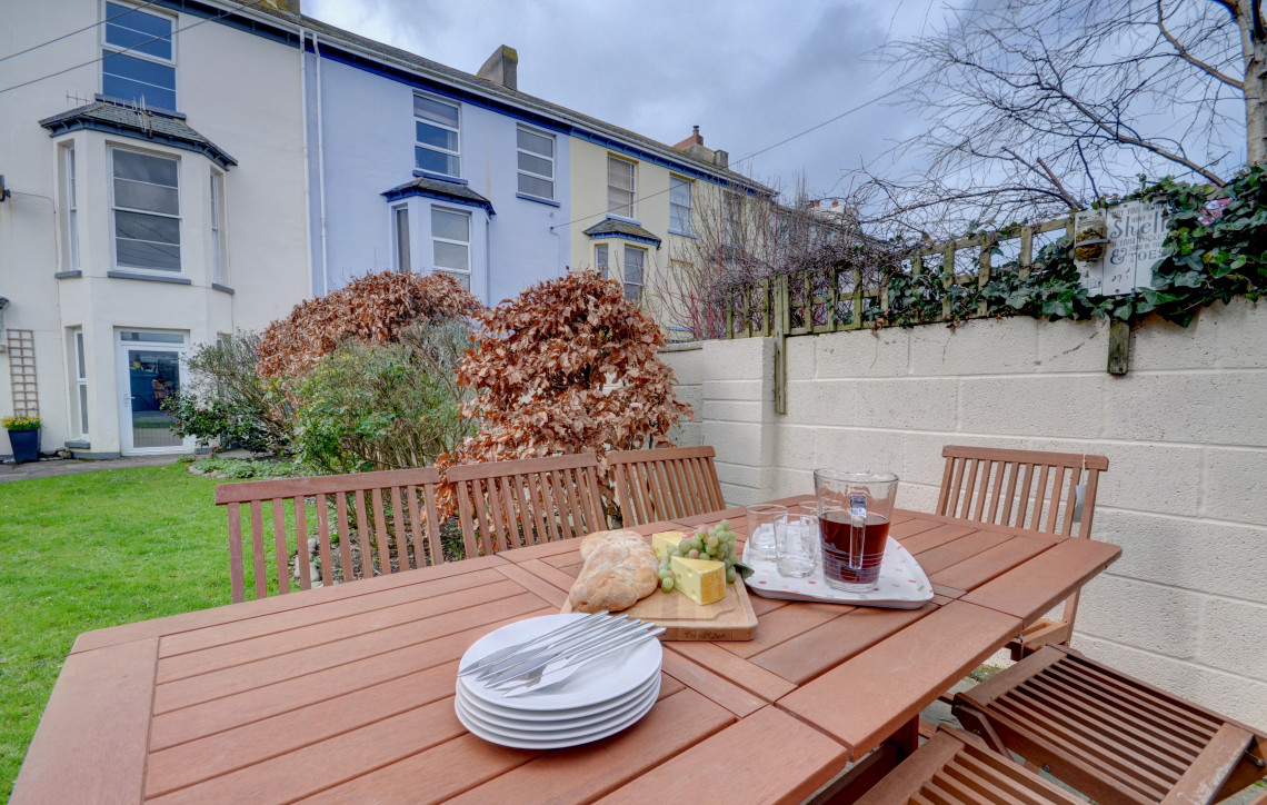 Outside: Lawned garden, patio area with seating