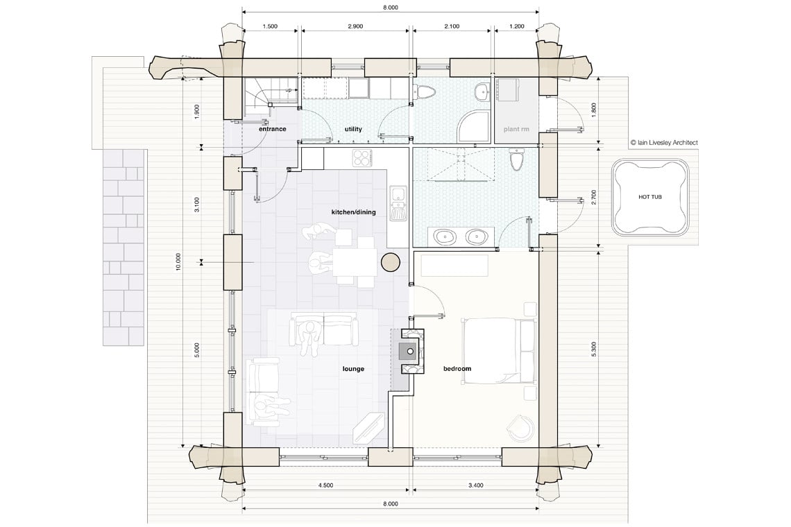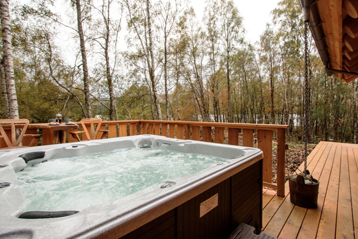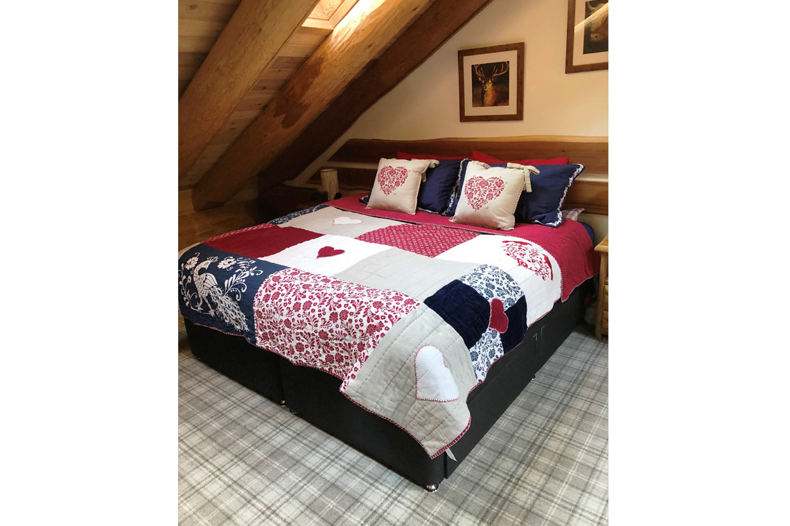 The cabin itself can accommodate up to six guests, with bedrooms all looking out onto the surrounding wild landscape. The master bedroom prides itself on a comfortable king size bed, with en-suite wet room leading out to the hot tub deck. Take a dip amongst the trees and unwind to the sounds of the babbling burn.