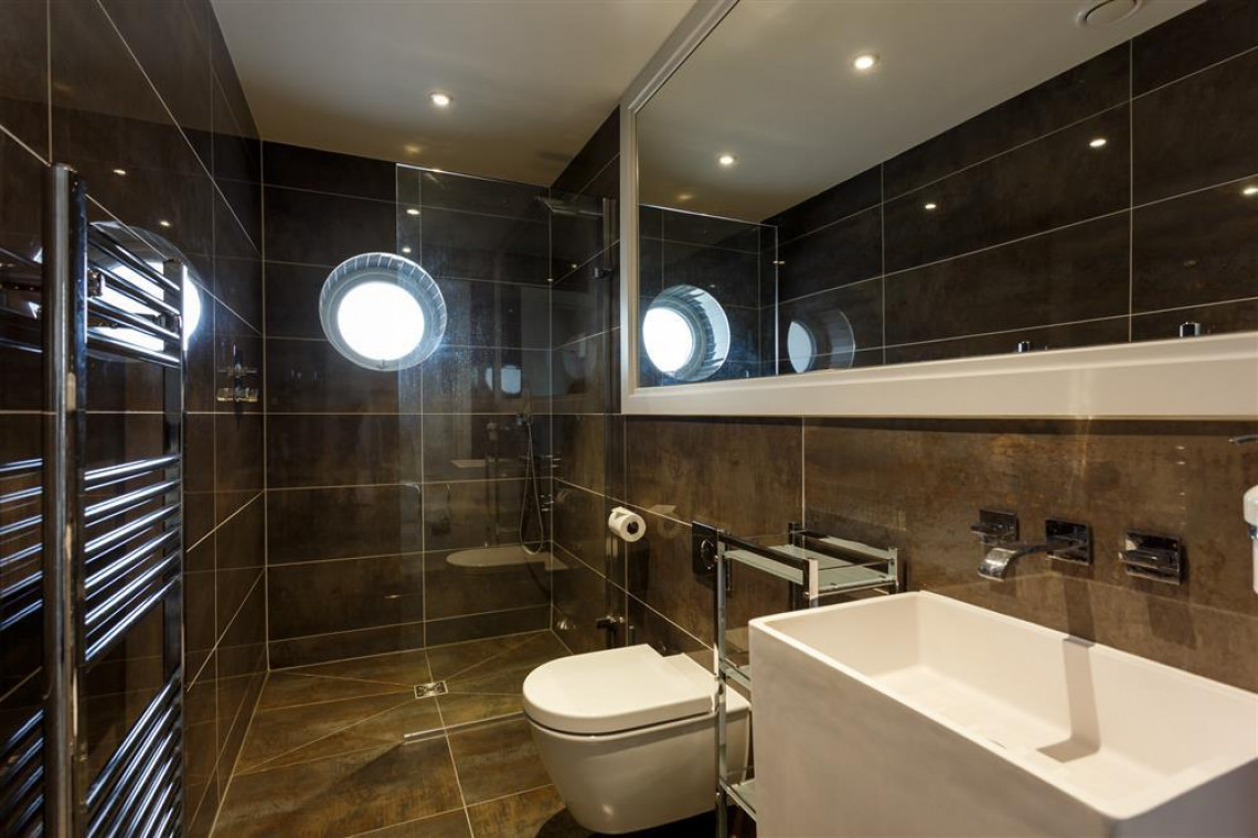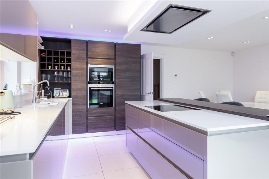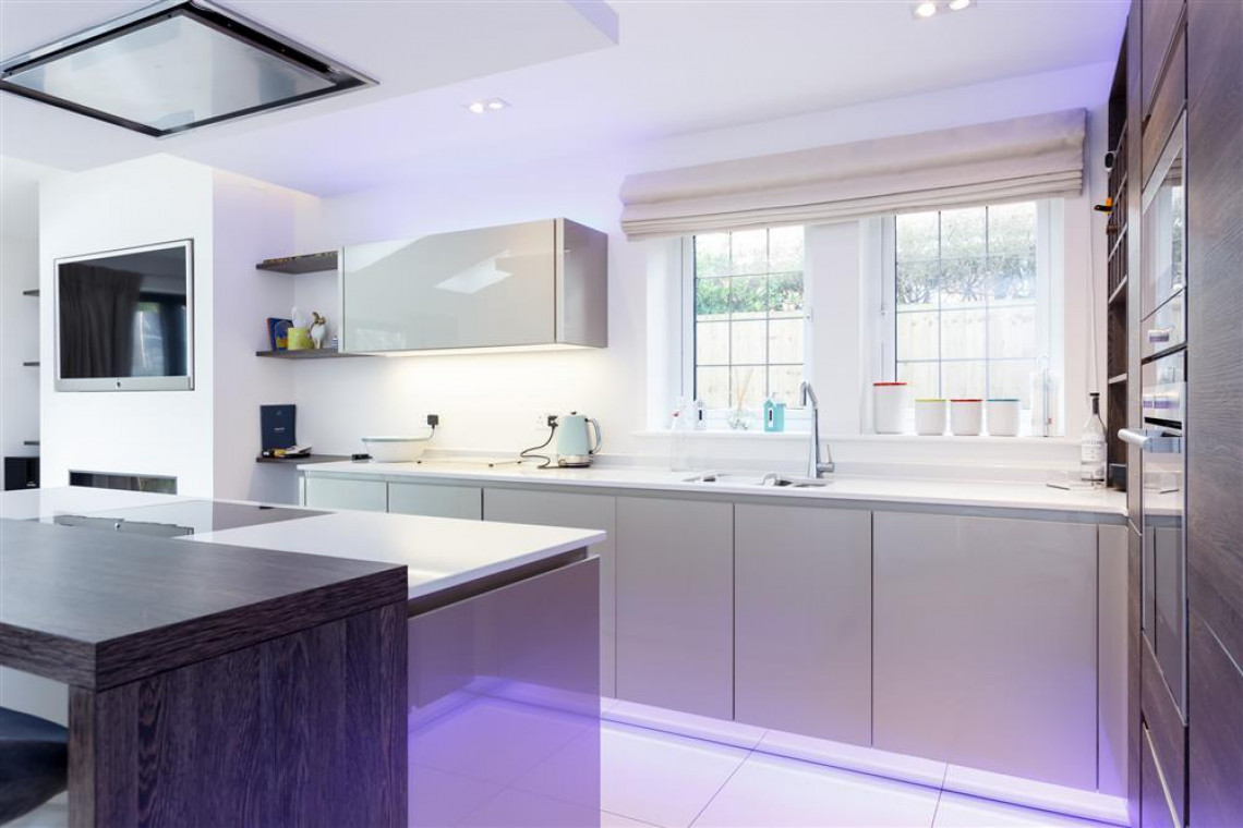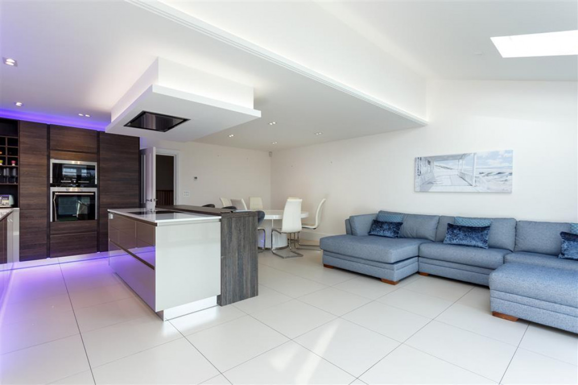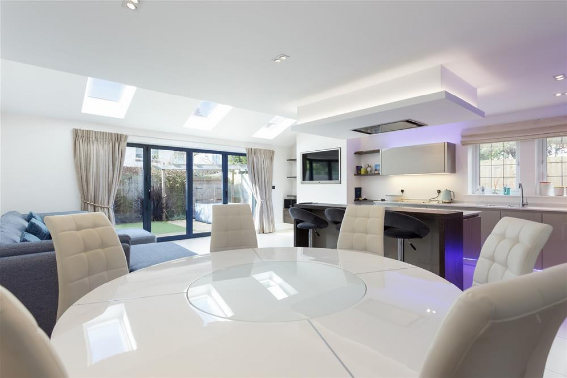 The large hallway leads to a bespoke, open plan kitchen, dining and lounge area with bi-fold doors opening out onto the private garden. The beautifully fitted kitchen includes an oven, microwave, hob, dishwasher and washer dryer. The dining area seats eight and the lounge has large comfortable sofas, TV and a living flame feature fire. The area is bright, spacious and contemporary and is the hub of this stunning house.