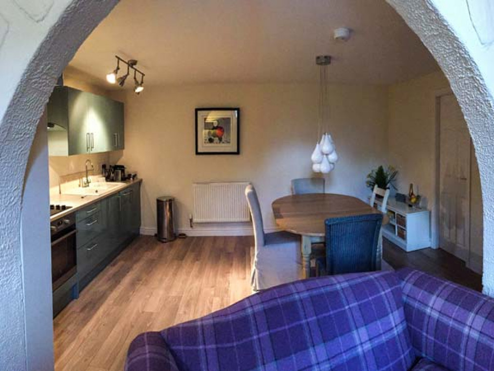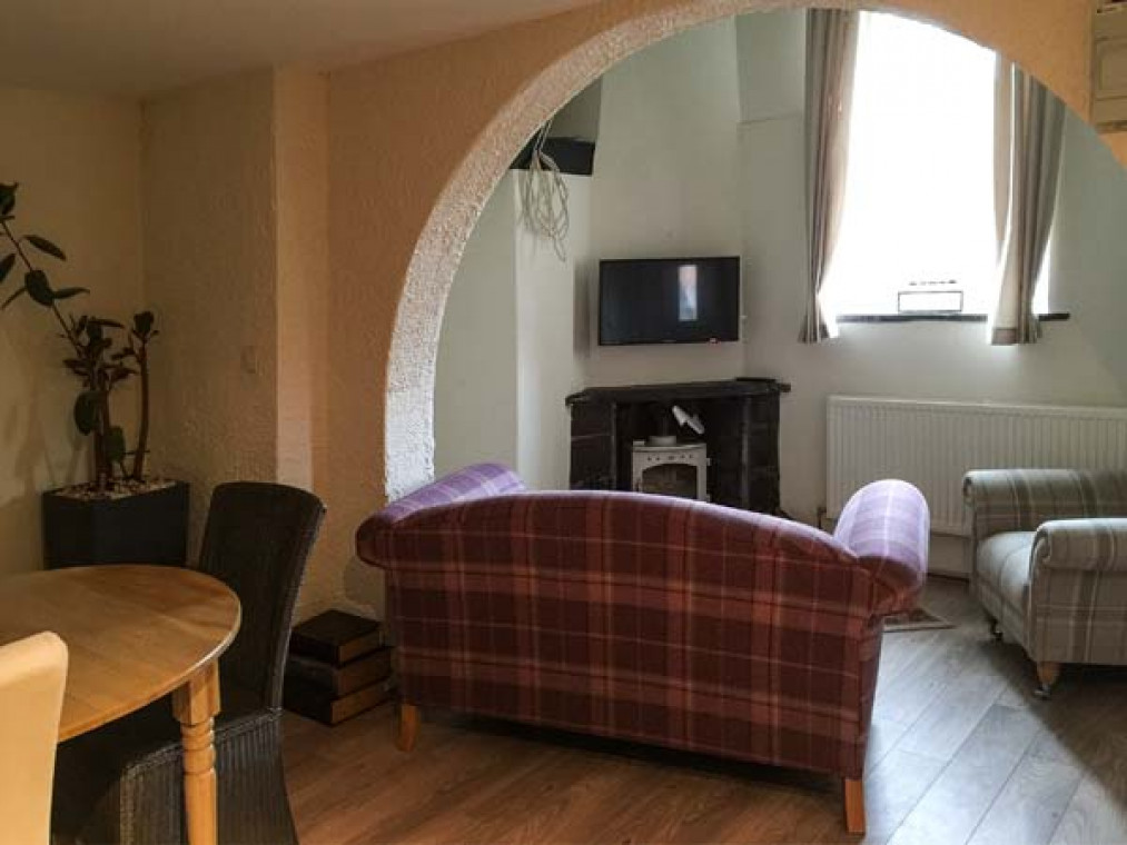 Kingfisher Apartment is an exceptionally, well-appointed ground floor apartment, close to the centre of Betws-y-Coed, yet in a quiet riverside location on the banks of the River Conwy in the Snowdonia National Park. Renovated to a high standard throughout, this Victorian building together with Bridge View, the adjoining property was formerly the Betws-y-Coed magistrate's court. The apartment is perfect for a couple looking for a romantic getaway from it all and provides an ideal base for exploring the Snowdonia National Park and surrounding areas. The living area is open plan with a cosy sitting area and features a high ceiling, characterful beams and a warming woodburner, the perfect place to sit and relax in the evening after a busy day out and about. This living area extends to a comfortable dining area and a well-equipped, modern kitchen area providing everything you may need to create that romantic meal for two! Off the living area is a modern shower room which leads through to the king-size double bedroom which completes this delightful apartment. Outside, there is off road parking and a pretty courtyard frontage with lovely planted borders. Being in the Snowdonia National Park there are excellent walks from the cottage, beautiful scenery and waterfalls in abundance, all within easy reach, plus all the village amenities are on your doorstep, with an array of shops, galleries, numerous pubs, coffee shops and restaurants to choose from. For the outdoor enthusiast there are various activities, including whitewater rafting, golf, a surfing centre, climbing and mountain biking, while the lovely towns of Blaenau Ffestiniog, Conwy, Llanberis and Llandudno are within easy reach. This is a superb apartment, and is an ideal base for exploring this area at any time of the year. All ground floor. One king-size double bedroom with en-suite shower, basin and WC with Jack-and-Jill access to living area. Open plan living area with kitchen, dining area and sitting area with woodburner. Amenities for Rental Ficcher storage heaters with woodburner Electric oven and hob, microwave, fridge, freezer, washing machine, slimline dishwasher, TV with Freeview, Amazon fire stick with Netflix, TV, DVD, Bluetooth speaker, iPod dock, WiFi fibre optic broadband, selection of books, games and DVDs Fuel, power and starter pack for woodburner inc. in rent Bed linen and towels inc. in rent Off road parking for 1 car, plus additional roadside parking if required Front courtyard garden with furniture Two well-behaved pets welcome Sorry, no smoking Shop, pub and golf course 2 mins walk Betws-y-Coed railway station 4 mins walk Note: Babes-in-arms only Note: Although all ground floor, there are 3 steps up to the front door Note: The washing machine is located in a utility cupboard just off the sitting area with 3 steps down to it.