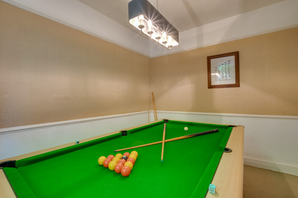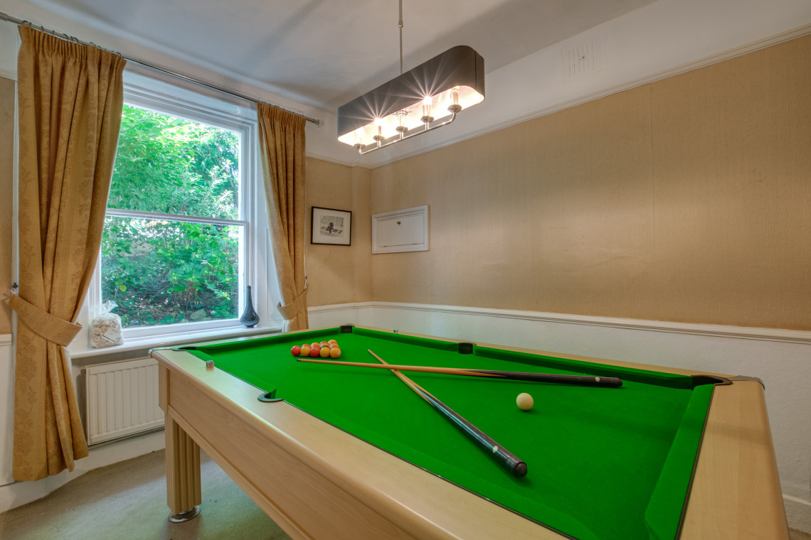 Kitchen/Diner: The kitchen is well equipped and has 5 ring gas Falcon Range cooker with double oven and grill, as well as warming drawer. Large fridge and drinks fridge available. Tall freezer in the garage. Full size dishwasher and microwave. Dining area with table and chairs for 8. Lounge:The area is furnished with a three seater sofa and two two-seater sofas and two coffee tables for your comfort. Smart TV 32’, DVD and books. Bedroom 1: Ground floor bedroom with a single bed, bedside table and lamp. Room: with a pool table for some entertainment.