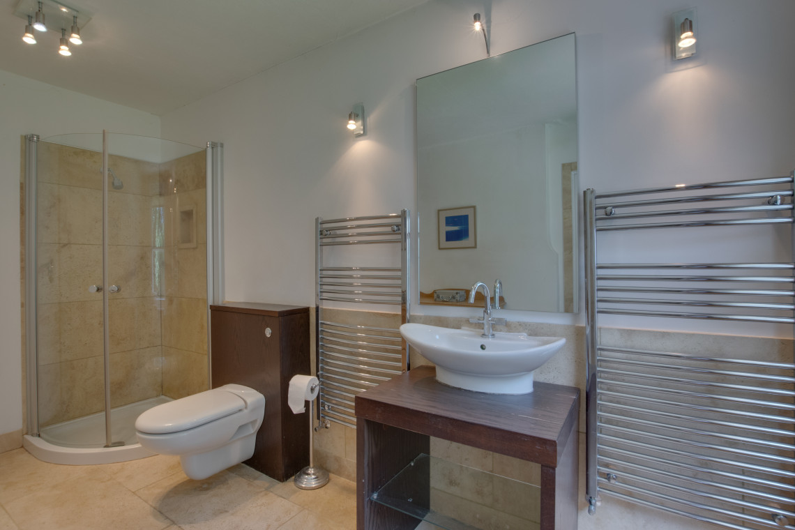 Bedroom 2:The master bedroom has a king size bed, two bedside tables with lamps, wardrobe, desk and chair. En-suite bathroom with a corner walk in shower cubicle, WC and a hand wash basin. This Bathroom is accessed also via other door from Hallway. Bedroom 3:offers two Single beds, bedside table with reading lamps, a chest of drawers. Bedroom 4:this bedroom has a Double size bed, bedside tables with reading lamps, a wardrobe and desk with a chair. En-suite bathroom with a walk in shower, WC and sink, has sky pod light.