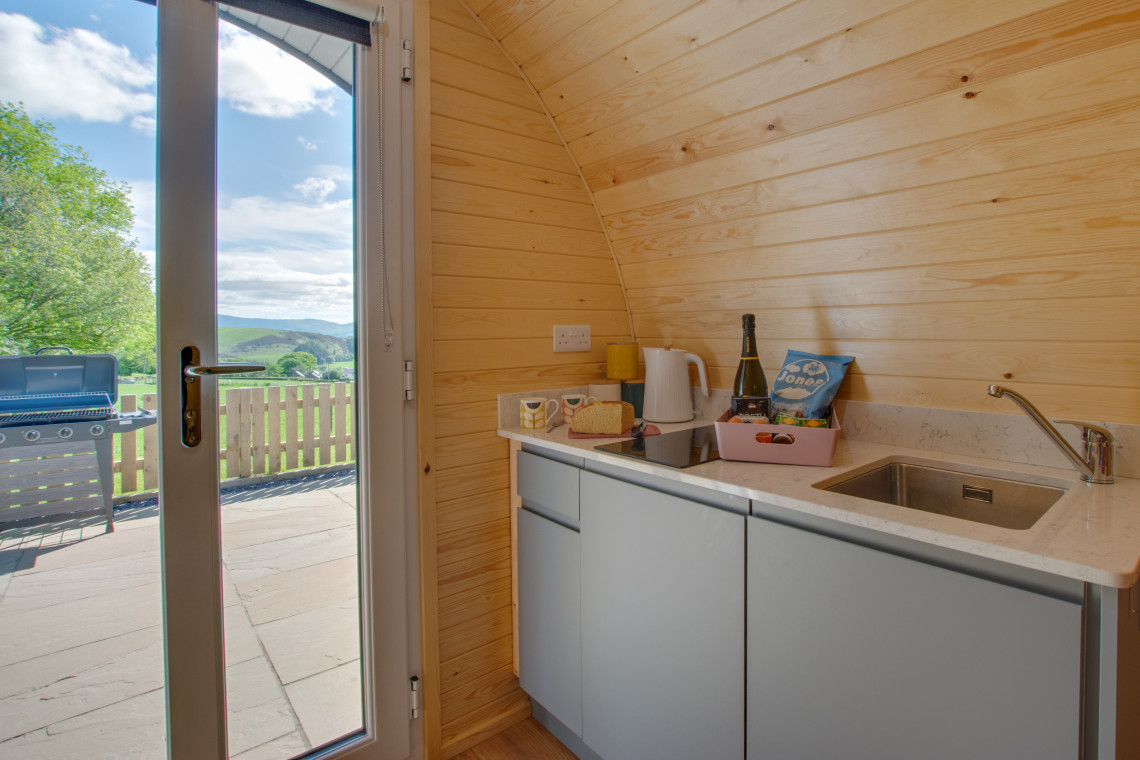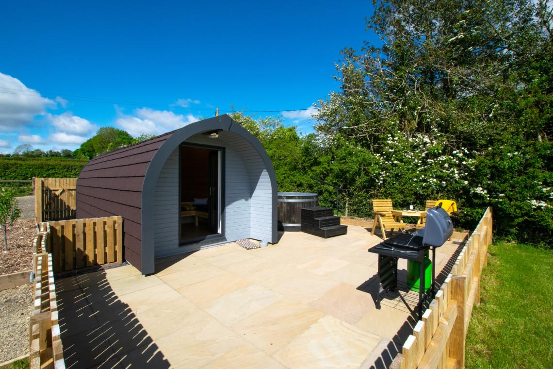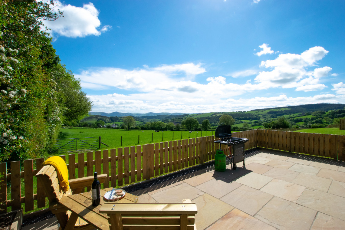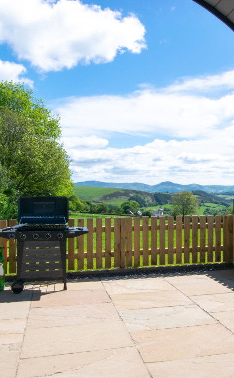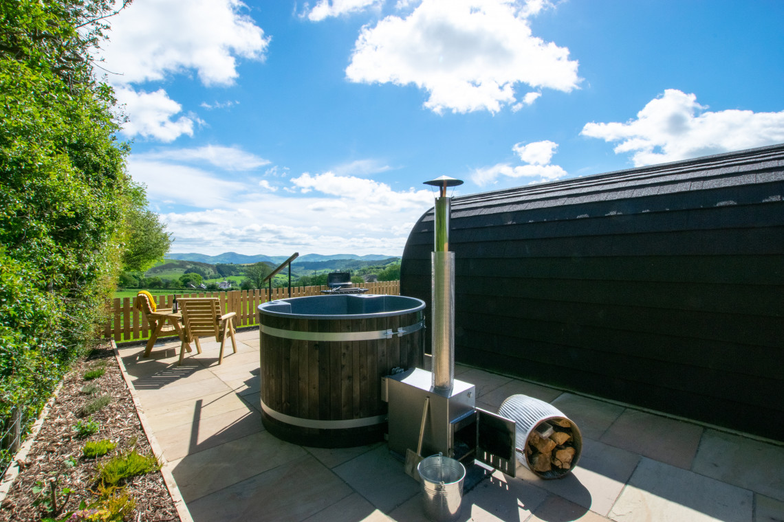 - Outside: Wood-fired hot tub and private courtyard with gas BBQ and locally made wooden seating. Uninterrupted views of Moel Famau, framed by rolling hills. Secure storage for each individual lodge. Large enough for 2 bicycles, fishing equipment, boots and hanging room for outdoor clothing.