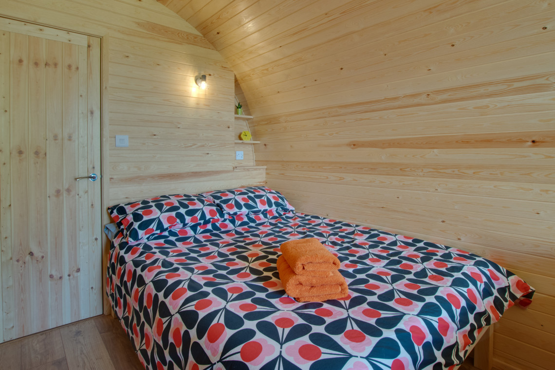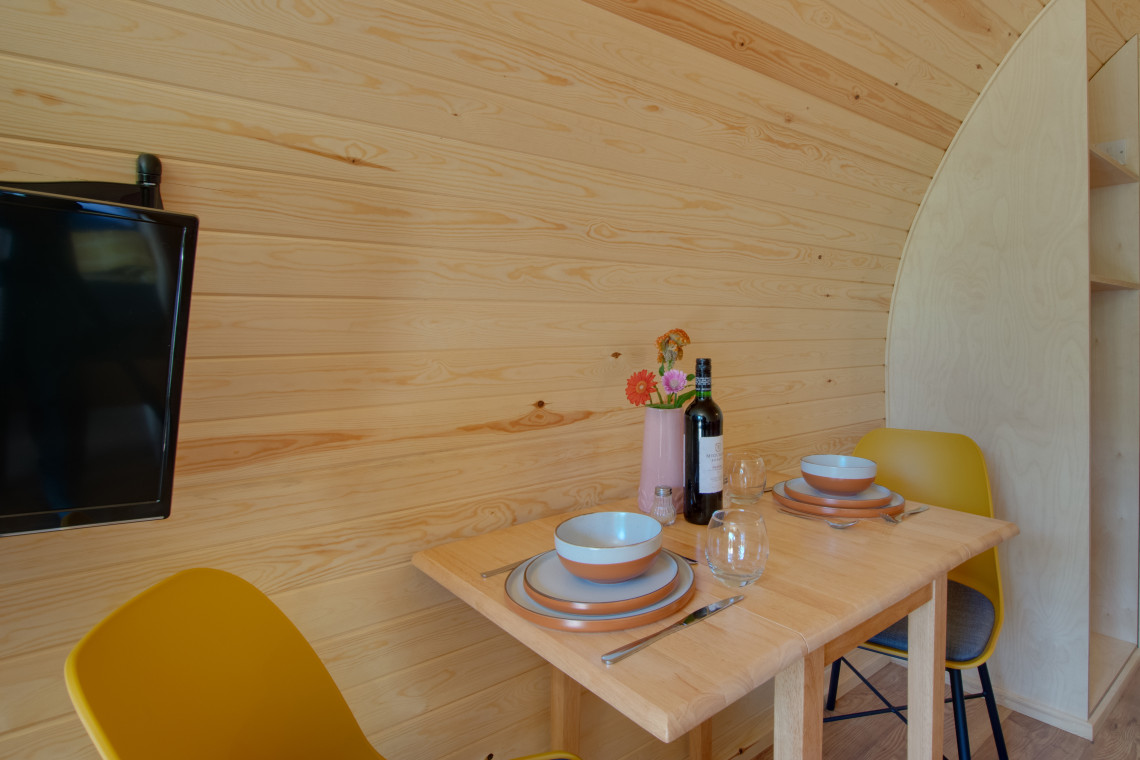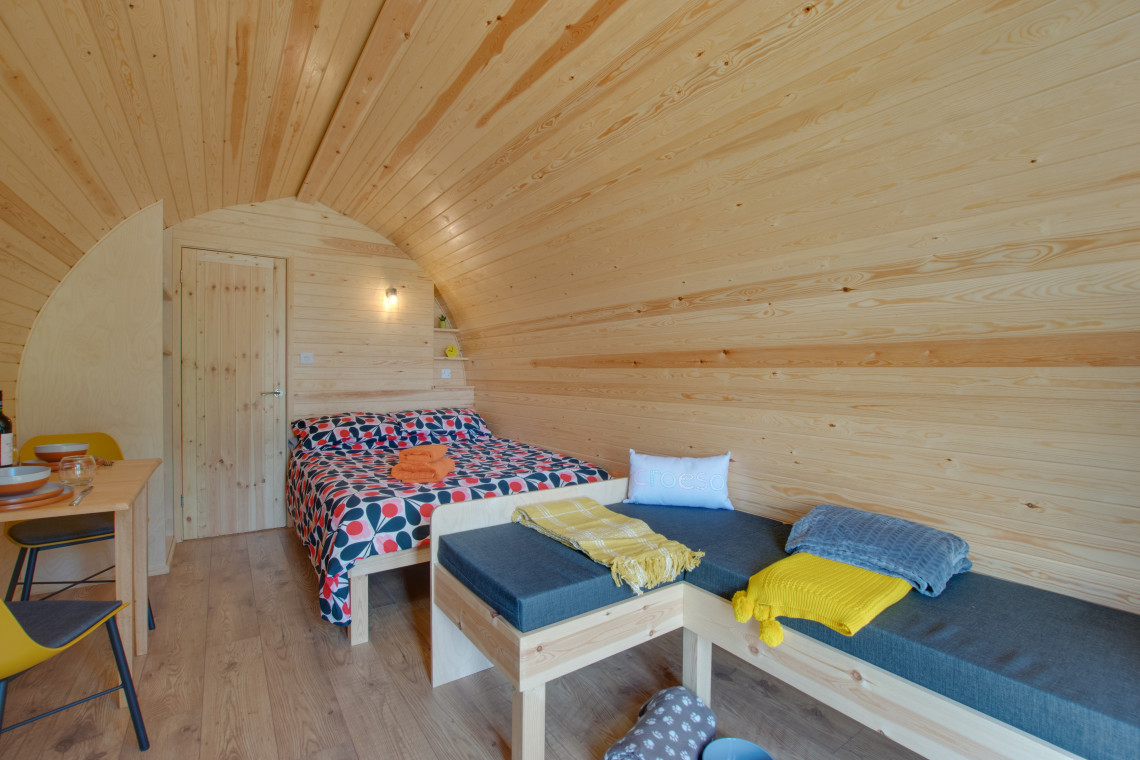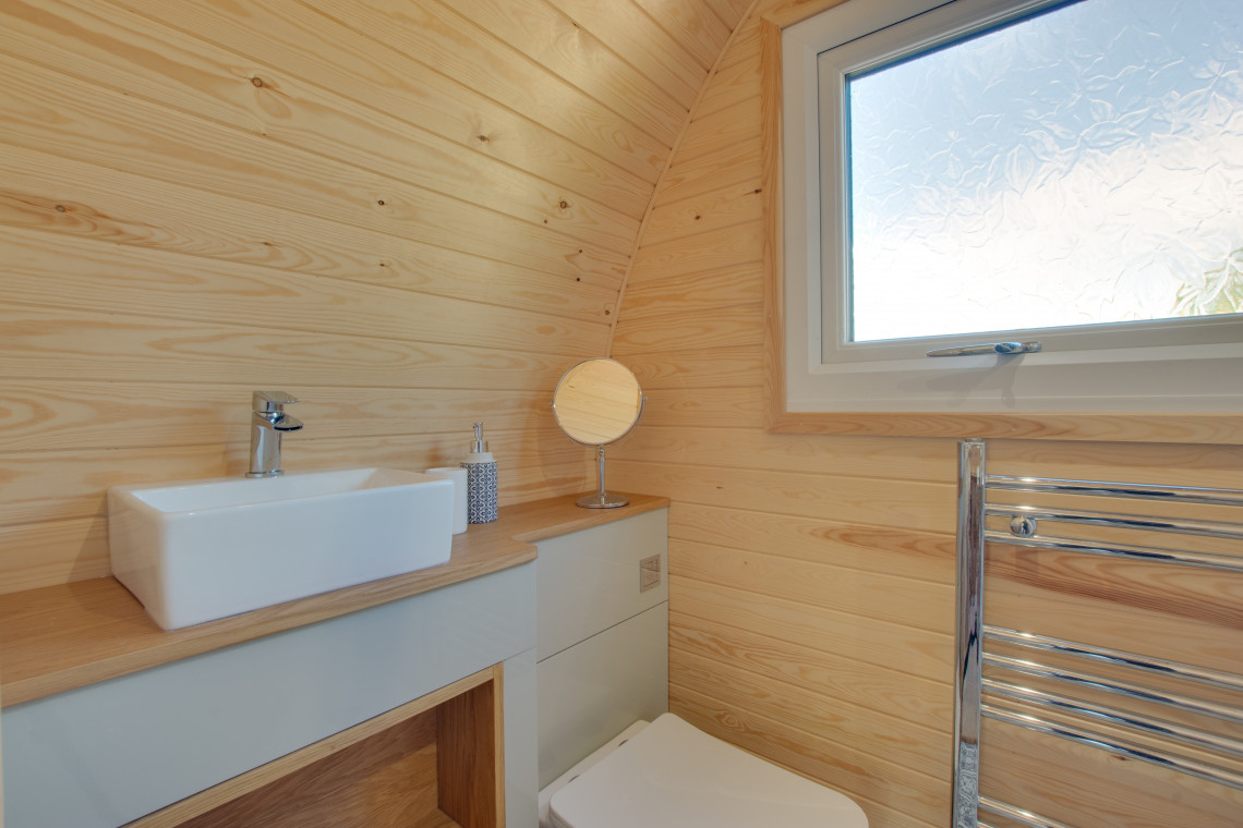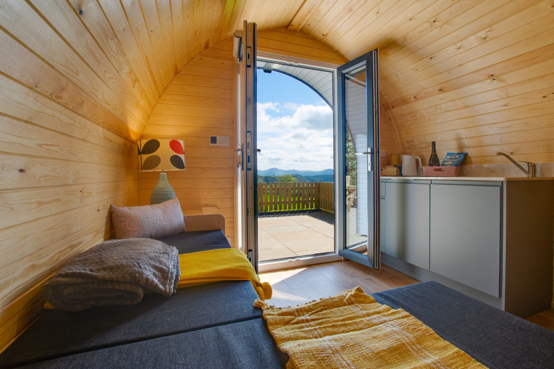 Boasting far-reaching views of Moel Famau from the comfort of the private wood-fired hot tub, this wonderful wooden glamping pod on the corner of a quiet working farm is the perfect rural getaway. The open plan design provides a bright spacious living area while the exposed woodwork and curved ceiling add a cosier touch. The functional kitchenette and shared use of a restored 1930's railway carriage with laundry facilities provide everything during your stay in the North Wales countryside.