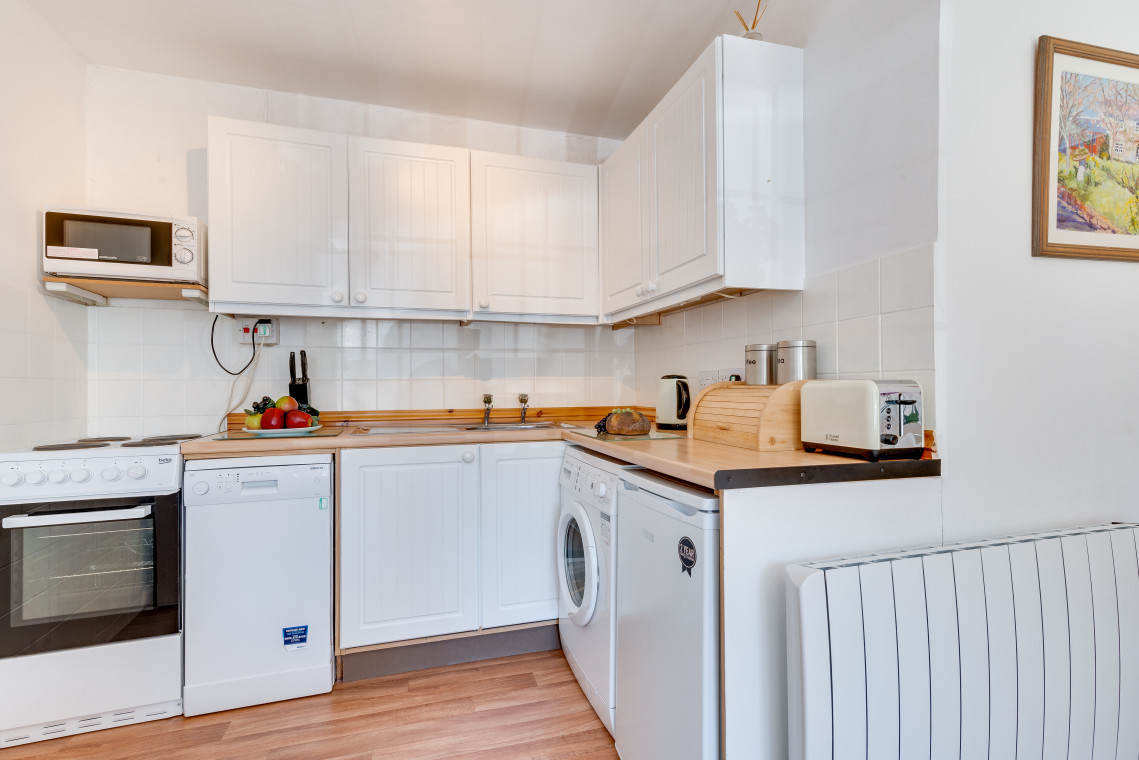 - Kitchen and utilities: Electric cooker, microwave, fridge with small freezer, dishwasher, washing machine, tumble dryer.