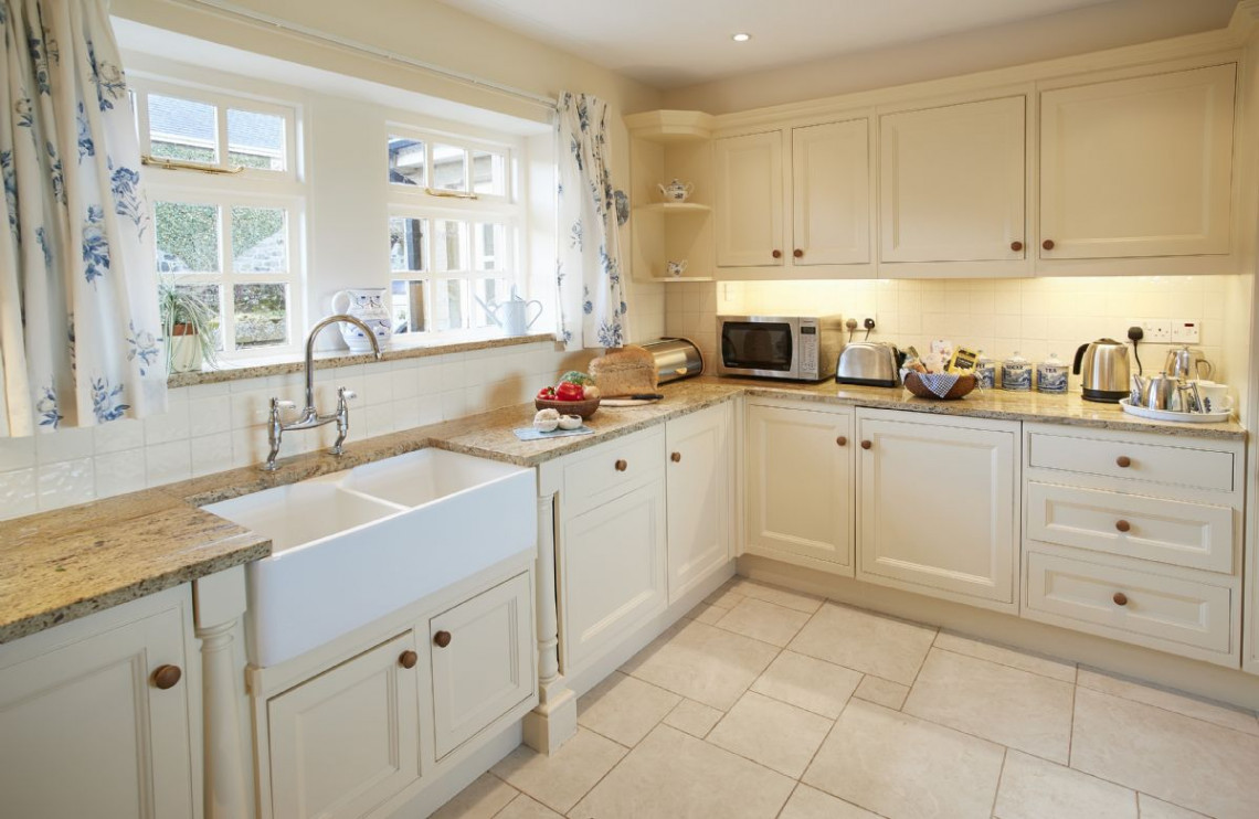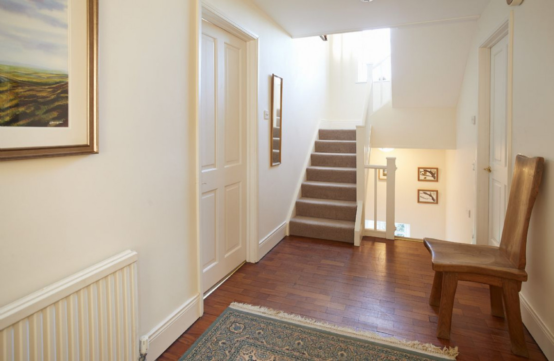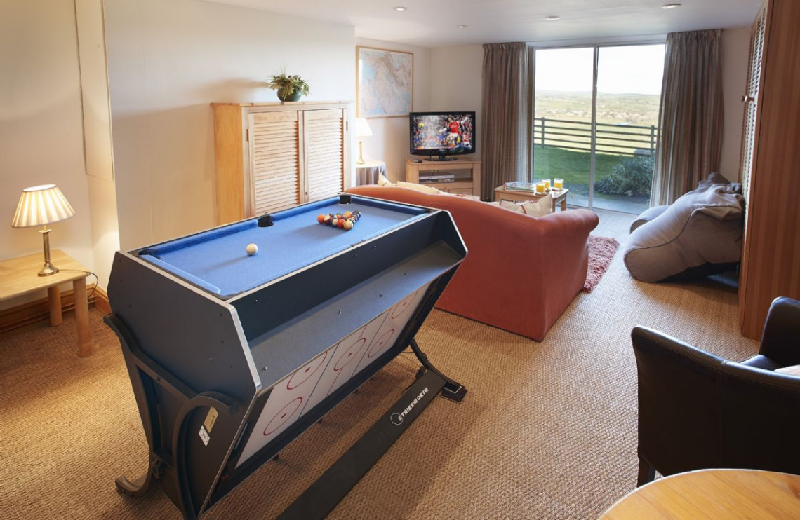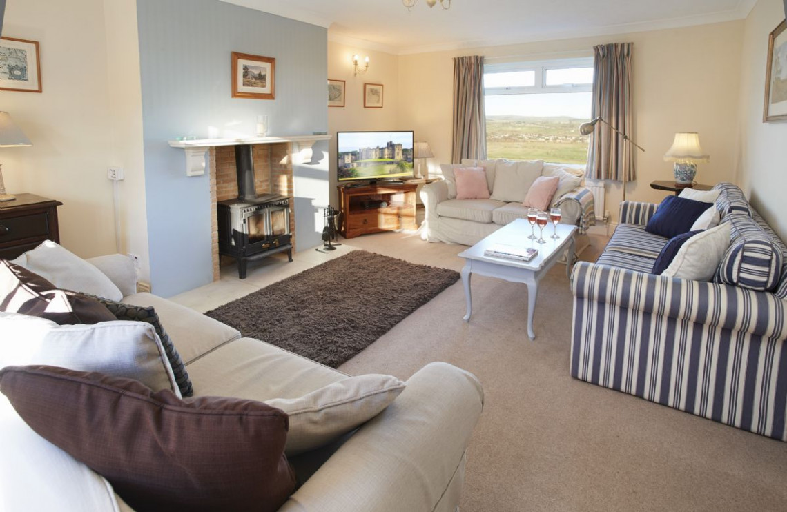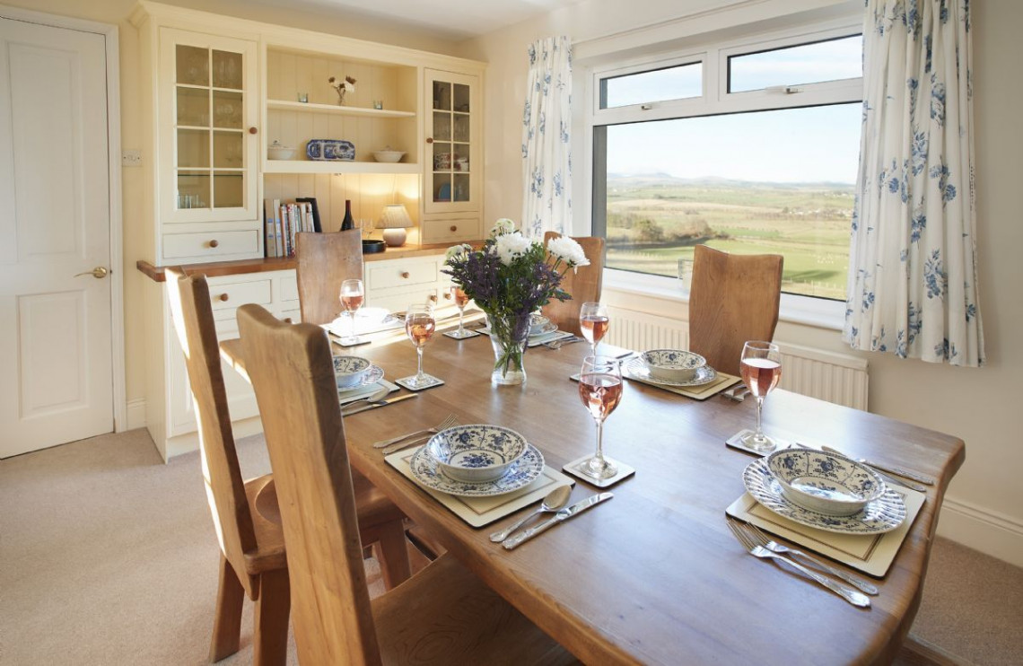 The open plan kitchen and dining room is a natural heart of the cottage, with a dining table and designer chairs, and a large window beyond. You could spend a perfect evening here, chatting around the Everhot range cooker while the young ones enjoy the table football or watch television in the games room. After a meal round the large dining table, why not relax into the large sofas of the living room and get a fire going in the wood burning stove.