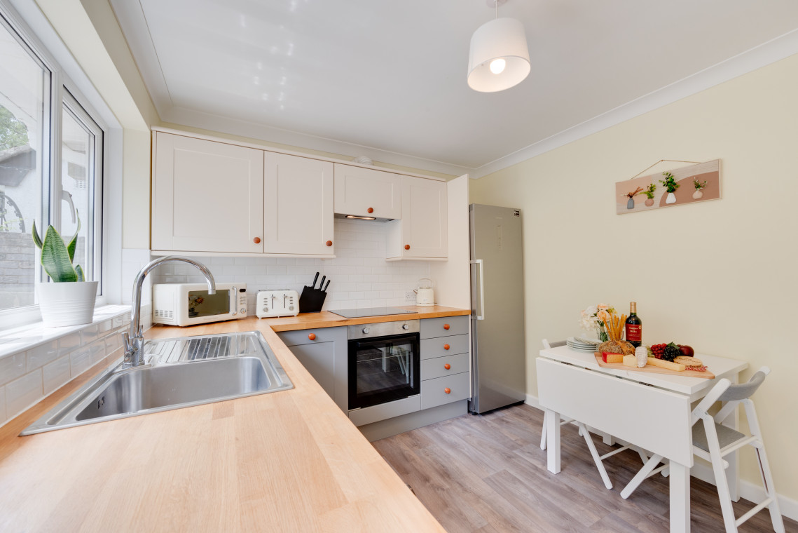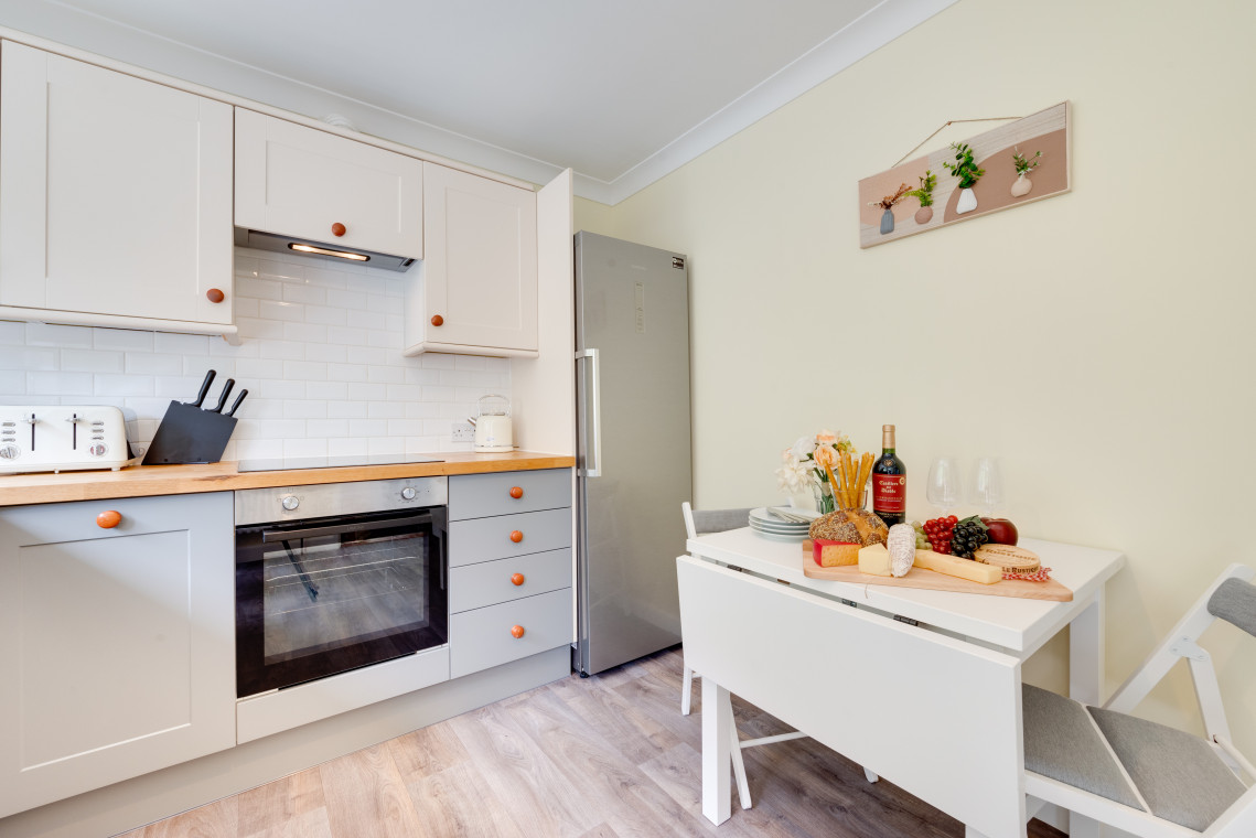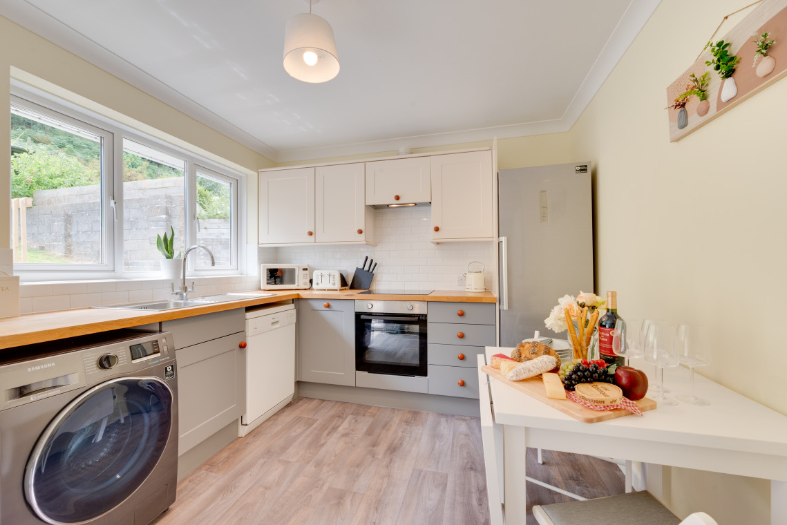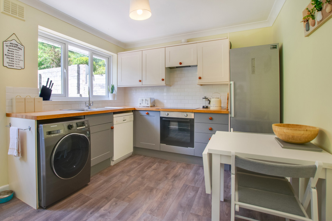- Kitchen and utilities: Oven with hob, fridge/freezer, washing machine, dishwasher, table and chairs.