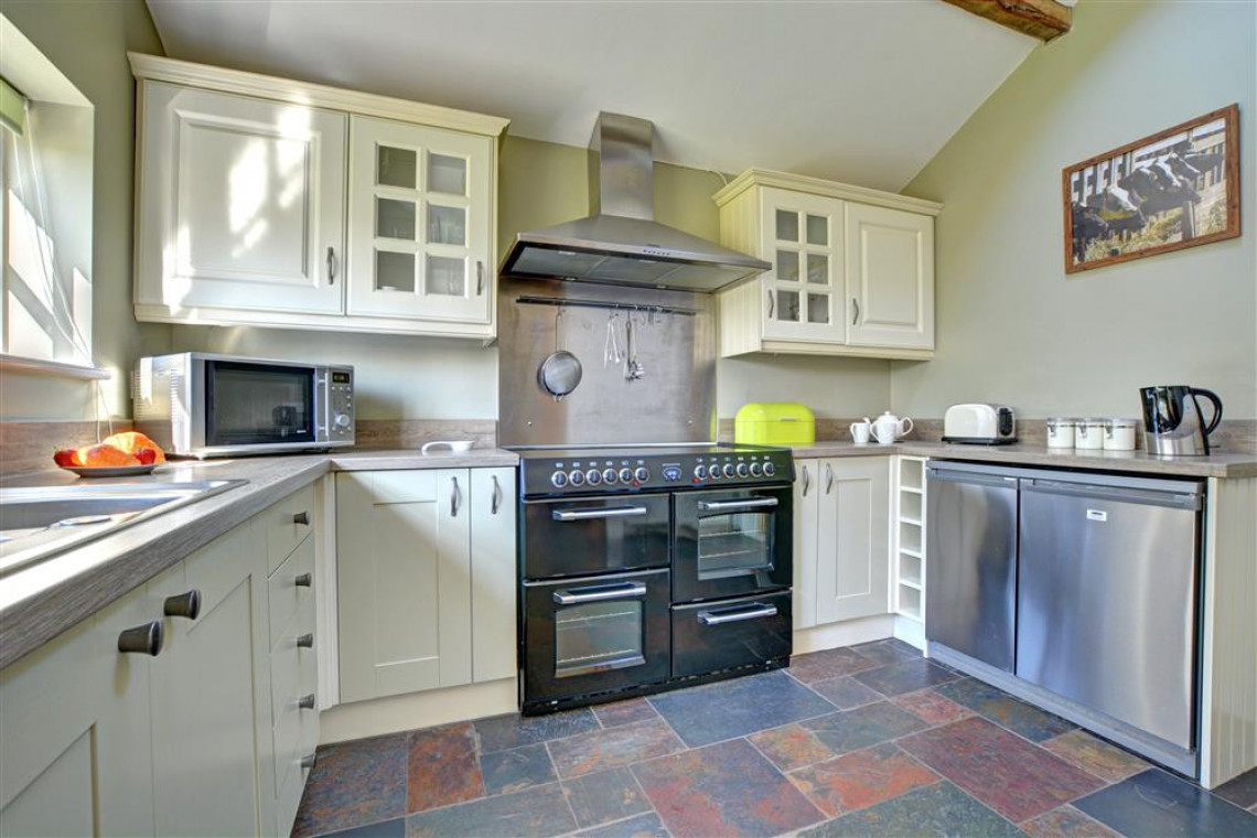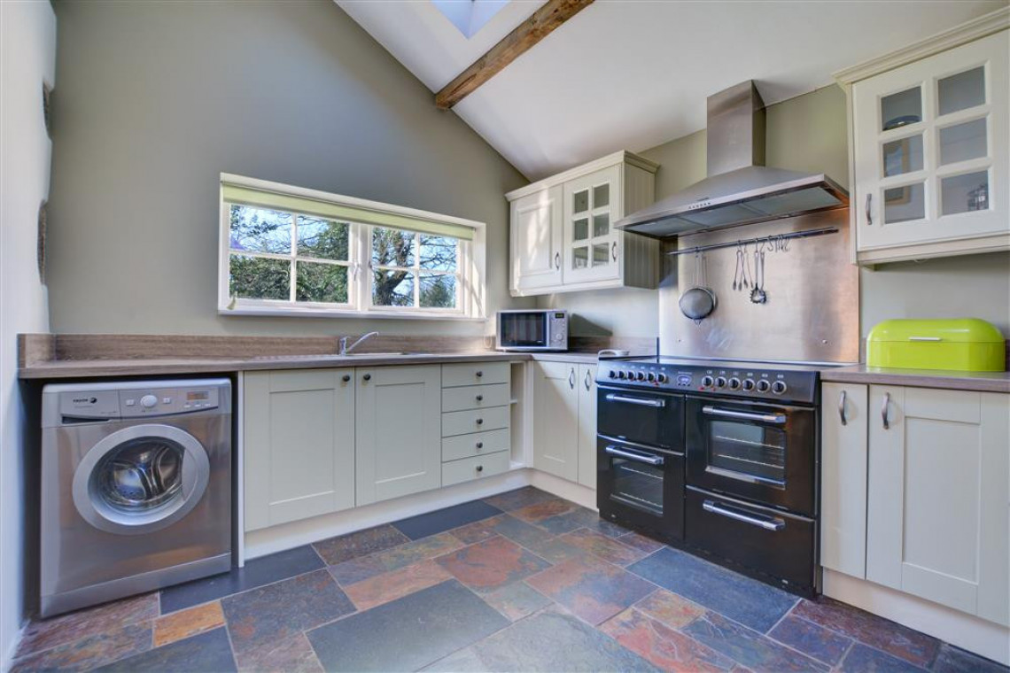 Kitchen: Fridge/freezer, electric range style cooker with ceramic hob and twin ovens, slow-cooker, microwave, washing machine.