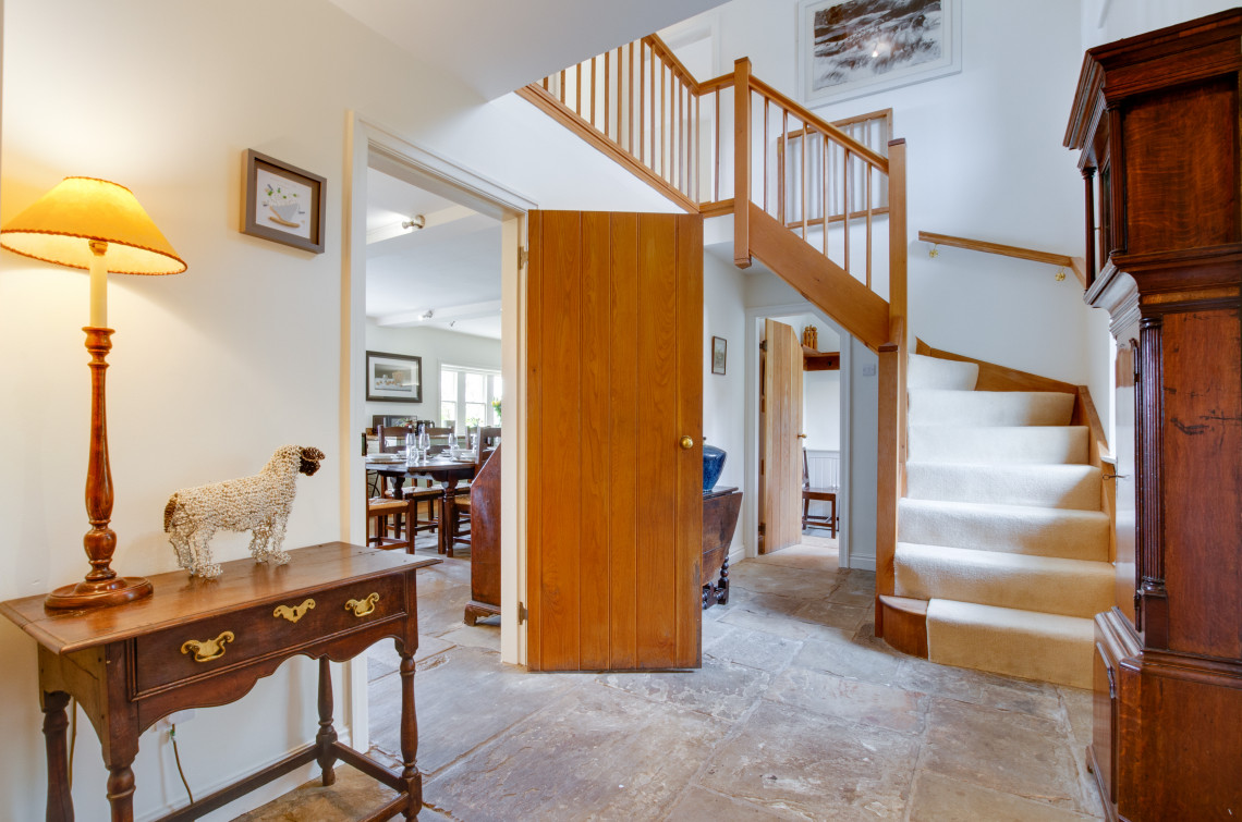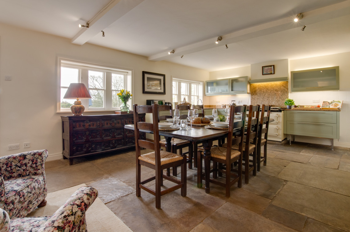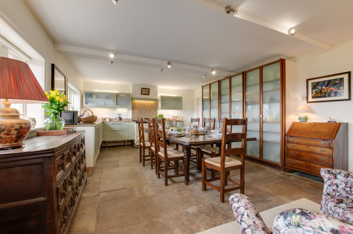 Davis Gate Farmhouse is perfect for a group getaway, be it family or friends. The terrace that wraps over one side of the house is a lovely spot for entertaining on a mild evening, with views over the lawned garden and across to the woods, a place to enjoy a soak in the Hot Tub and gaze up at the stars, being out of town, it's free of light pollution! The spacious interior provides a traditional farmhouse feel with exposed beams and flagstone floors. A log-burning stove brings a cosy glow and offers the perfect spot for a dog to lie by the fire after running free in the enclosed garden outside. Great care has been taken to furnish and decorate this property, high-quality artworks and prints have also been included for your delight. The kitchen and dining space provide a real family farmhouse atmosphere real high-quality country-living.