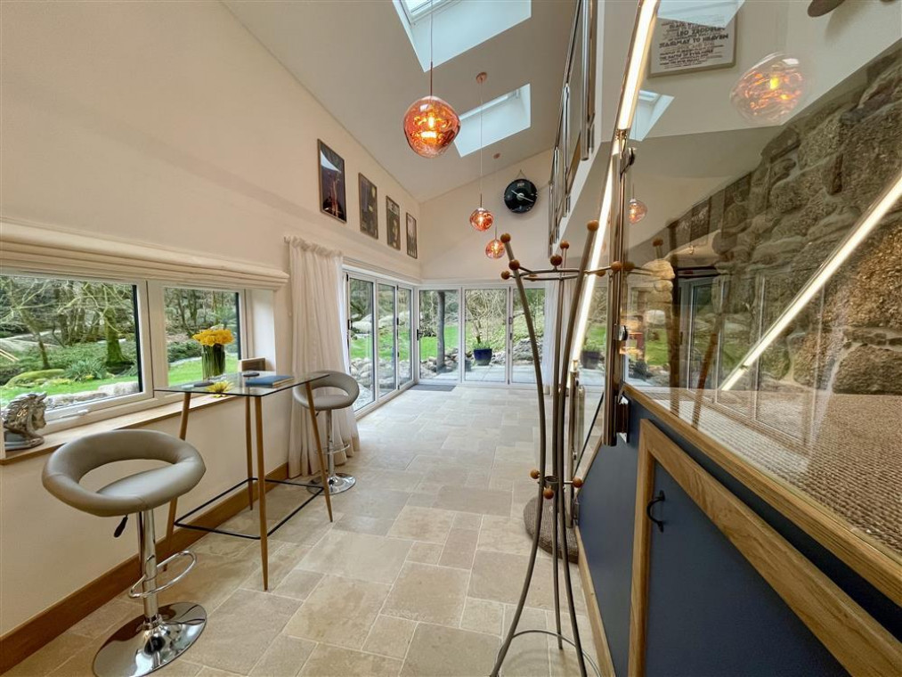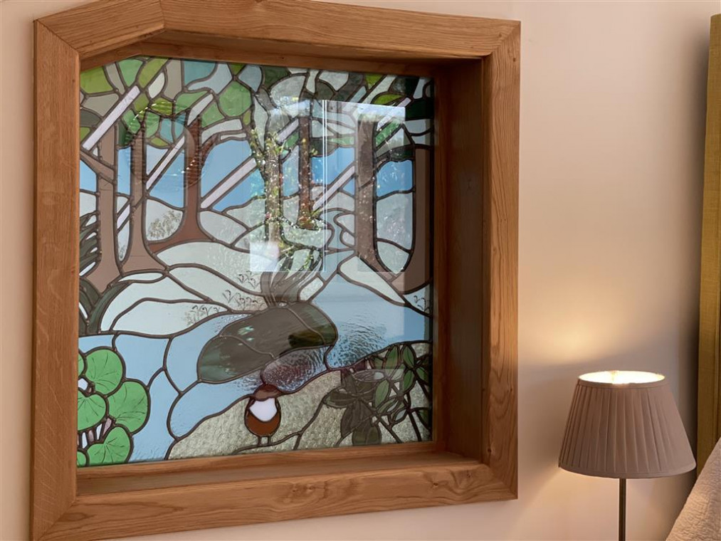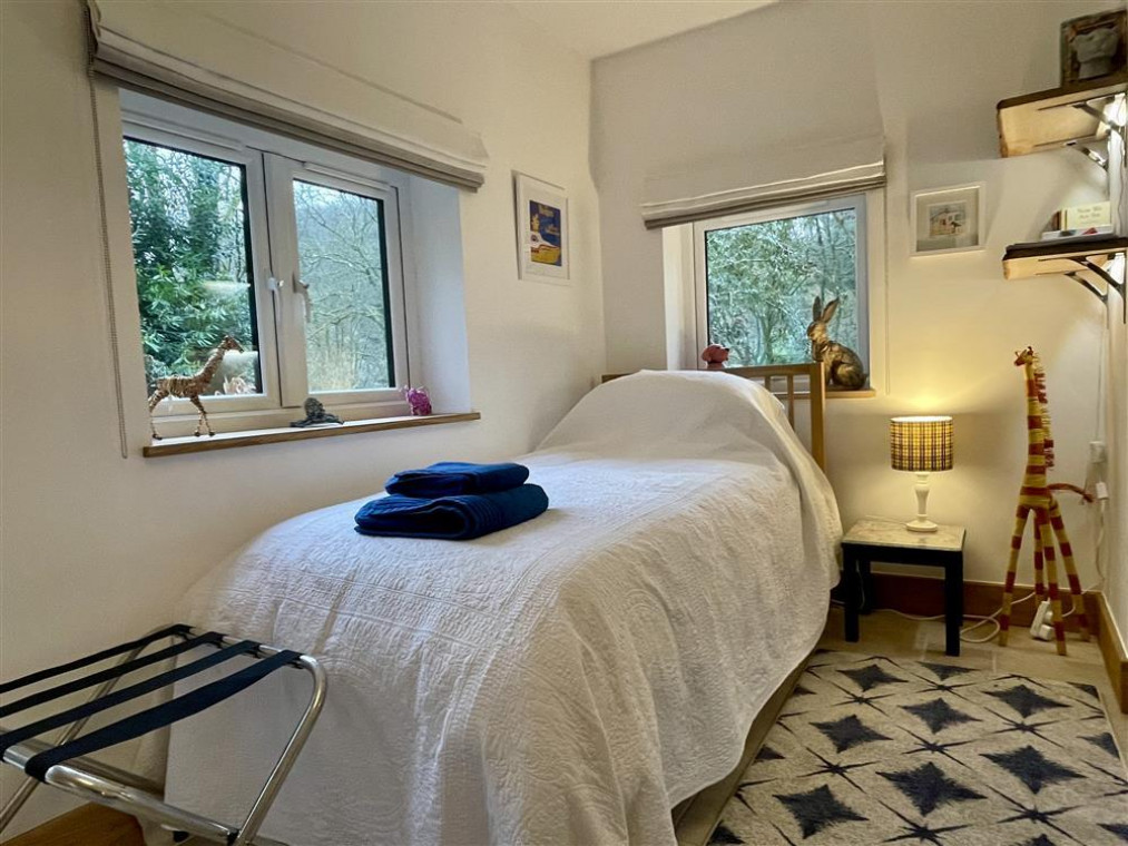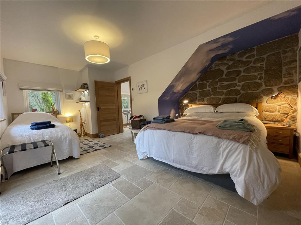 From the first floor is the external door to the rear terrace with pedestrian gate out onto the lane and direct access to the Luxulyan Valley. Opposite the kitchen is the master bedroom, with a king size bed. The window overlooks the woodland garden, a pair of internal stained-glass windows commissioned by the owners to celebrate the wildlife river setting (in particular the river nesting of the rare Dipper birds, after which this property is named), plus an en-suite shower room WC with a large walk-in glazed shower, hand basin with illuminated and magnifying shaving mirror plus infra-red switched heated and mirrored bathroom cabinet and heated towel rail.