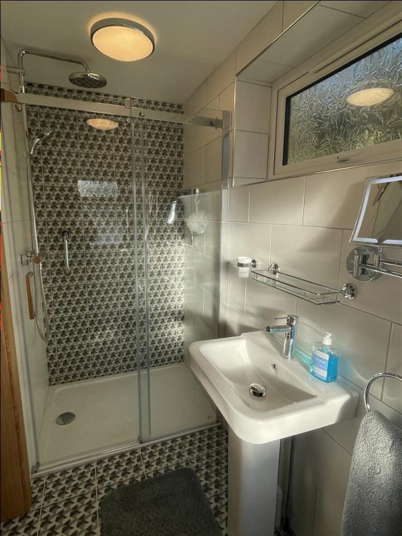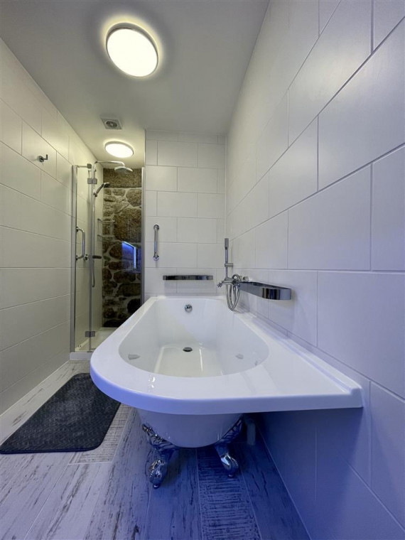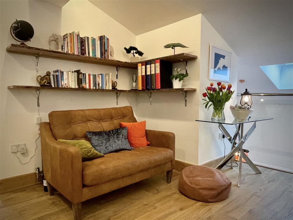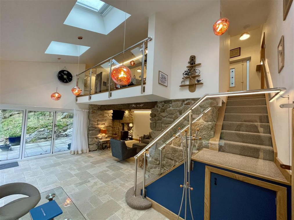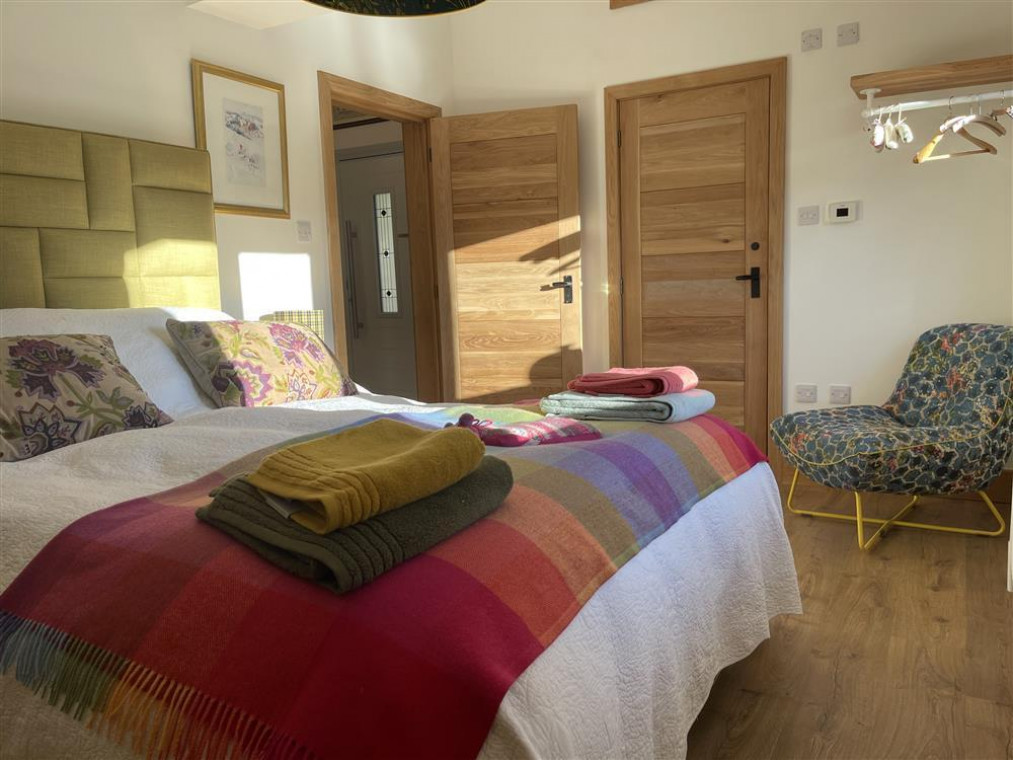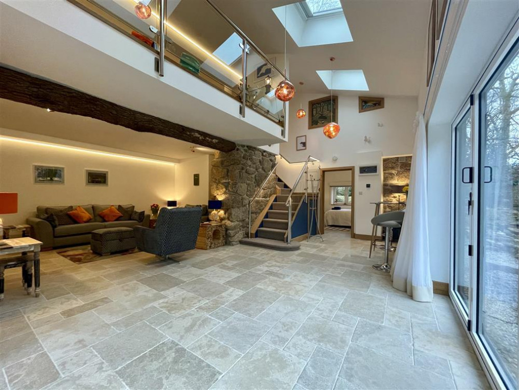 This stylish new cottage provides a ground floor with attractive and practical limestone floor which is warm underfoot, an airy garden room with dual aspect bi-fold doors making the most of the meadow, boulder strewn river and woodland setting. The sitting room has wood burner which sets the scene for cosy nights in with two sofas and a swing armchair with a wall mounted smart TV. The ground floor bedroom, also with limestone floor, an external door with step down to a side terrace, a king size bed and a 3ft bed with truckle bed beneath offering a versatile bedroom set up. The en-suite bathroom/WC with roll top bath, separate cubicle shower, plus infrared switched heated mirrored bathroom cabinet hand basin and heated towel rail. The utility room houses the washing machine and tumble dryer.