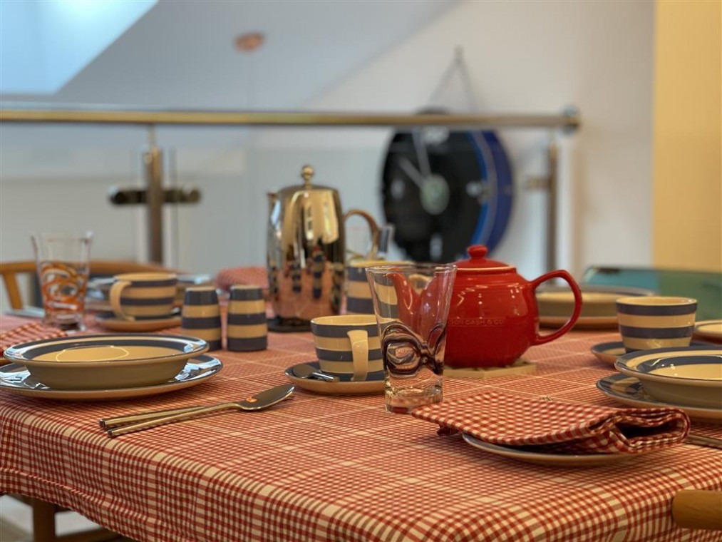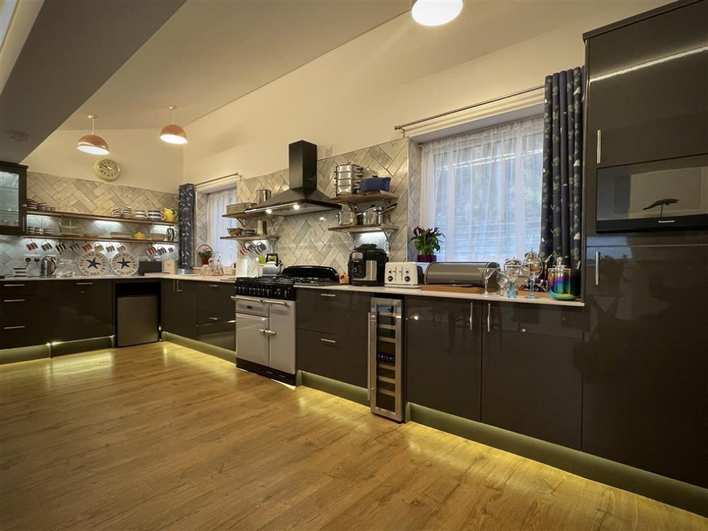 From the living space a dramatically lit carpeted glass and stainless steel 12 step turning staircase takes you to the first-floor accommodation, with engineered oak flooring and modern column radiators ensuring a cosy and welcoming space. You are greeted with a thoughtfully and well laid out cook's kitchen/dining room where the family can gather round the large kitchen table, relax on the sofa in library corner, chat and make use of the built-in facilities including a wine cooler, dishwasher, American fridge/freezer with ice maker/water cooler, Aga range cooker with a five-ring gas hob, 2 electric ovens and grill and built-in microwave. There is also a Nespresso coffee machine (please bring your own standard bucket shaped pods).