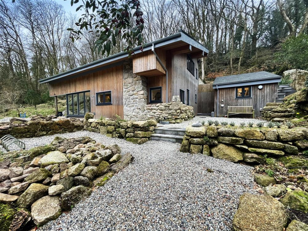 Stay - The Accommodation...From the narrow country lane an ungated entrance opens onto a narrow gravel driveway passing Dippers smaller sister cottage, Cider Press, and continues through the woodland garden alongside the pretty River Par opening into the gravelled parking area in front of Dippers. From the parking area (with cycle rack) walk along a gravelled patch through the garden to the terrace and entrance.