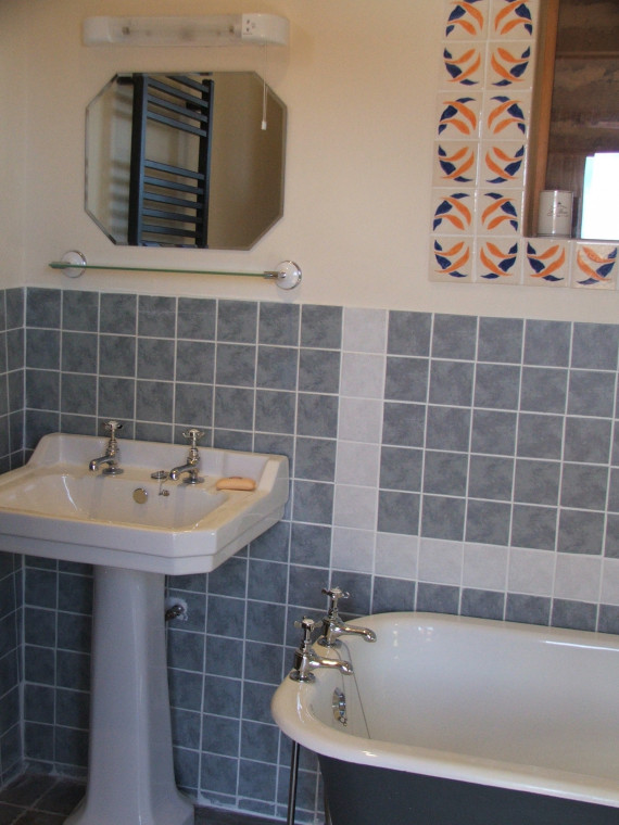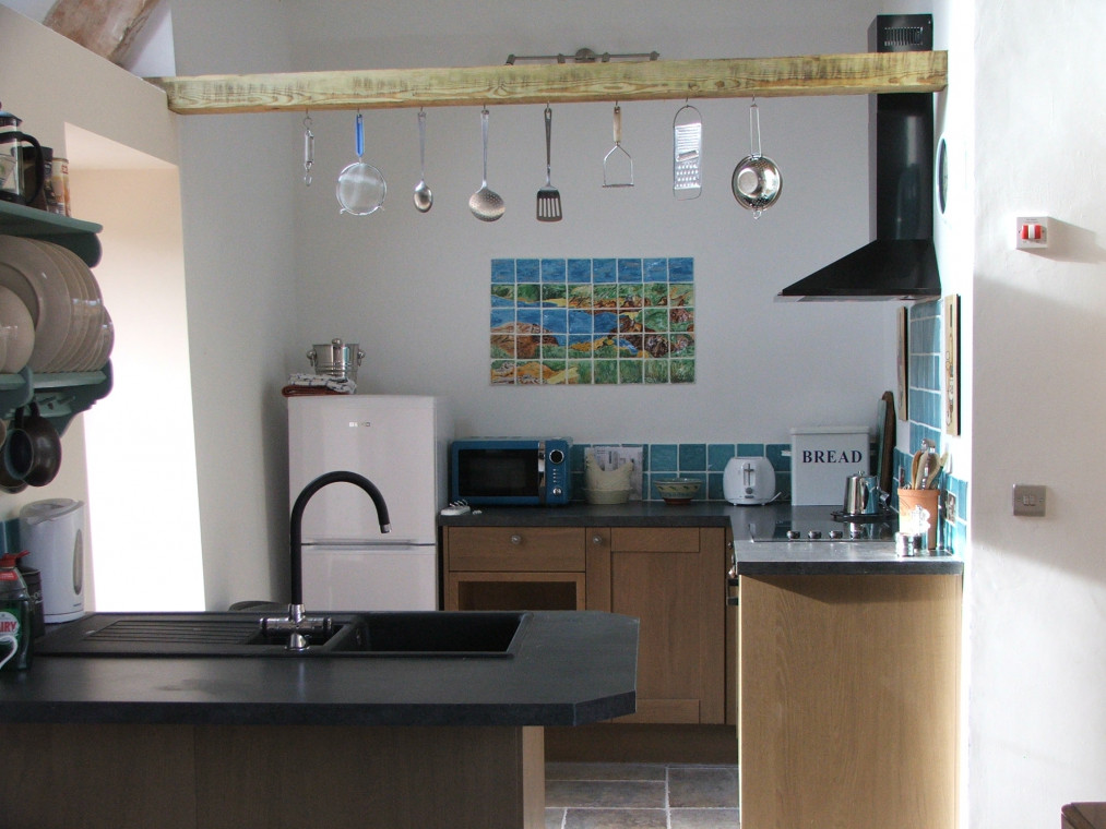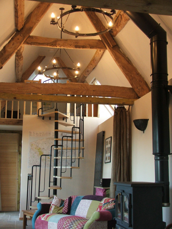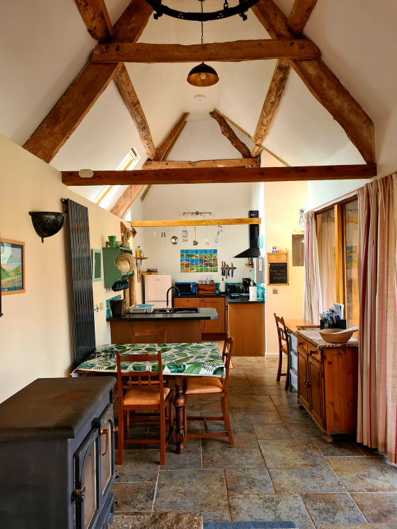 Inside there is a spacious open plan living area with a large wood burner for cooler evenings. Logs are supplied but of course there is also central heating throughout the building. There is a ground floor bedroom (double bed) with adjacent en-suite containing toilet and washbasin. The bedroom has a door opening on to the covered outside patio. The kitchen is well supplied with cooking equipment and includes fridge freezer, oven with ceramic hob, microwave, coffee maker, dishwasher and toaster. The living area has a sofa, a TV and DVD player and a CD player and radio. The main bathroom has a toilet, washbasin, bath and shower. The second bedroom is accessed by a spiral staircase and contains a double bed. Please note - this room is compact with low beams and is not suitable for young children or anyone with limited mobility.  It's an ideal space for a teenager or single adult. A spacious Orangery leads from the kitchen to the rear garden.  This is additional ‘spill-out’ space with comfy chairs in a sunny room. the large back garden and where there is also a large outdoor table and chairs.