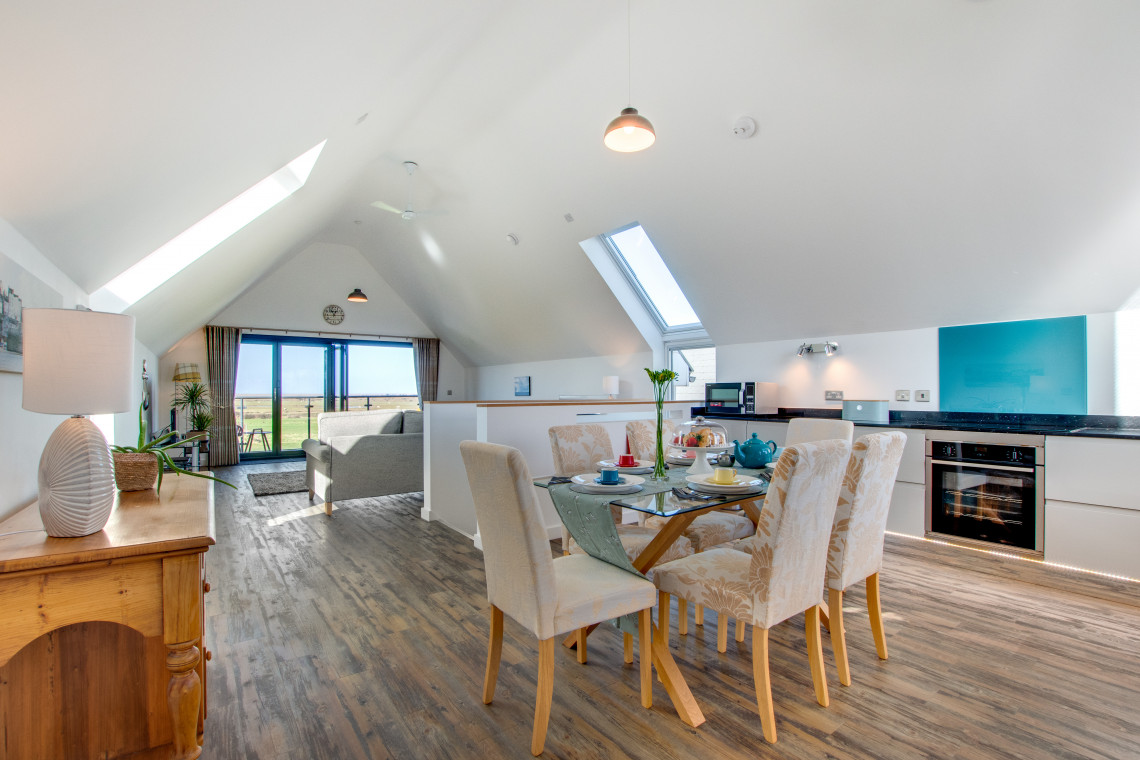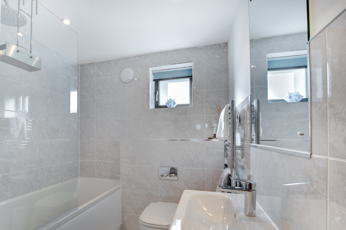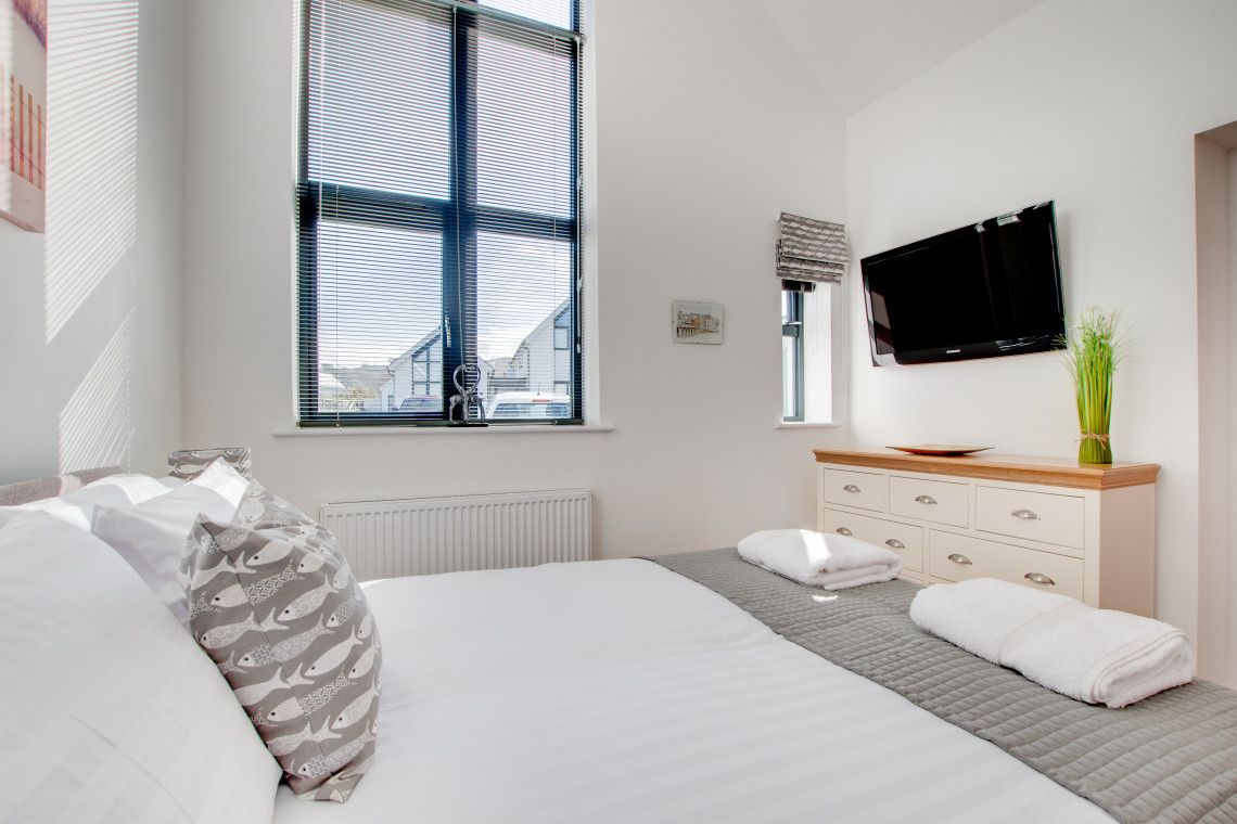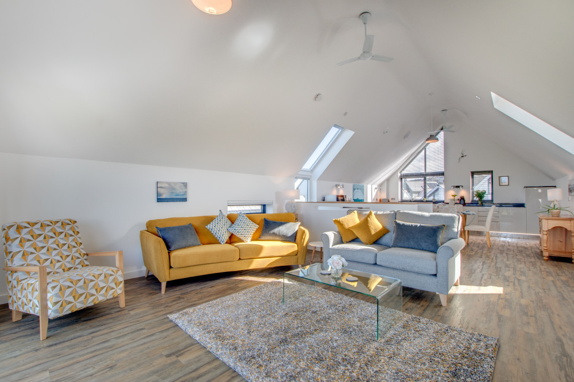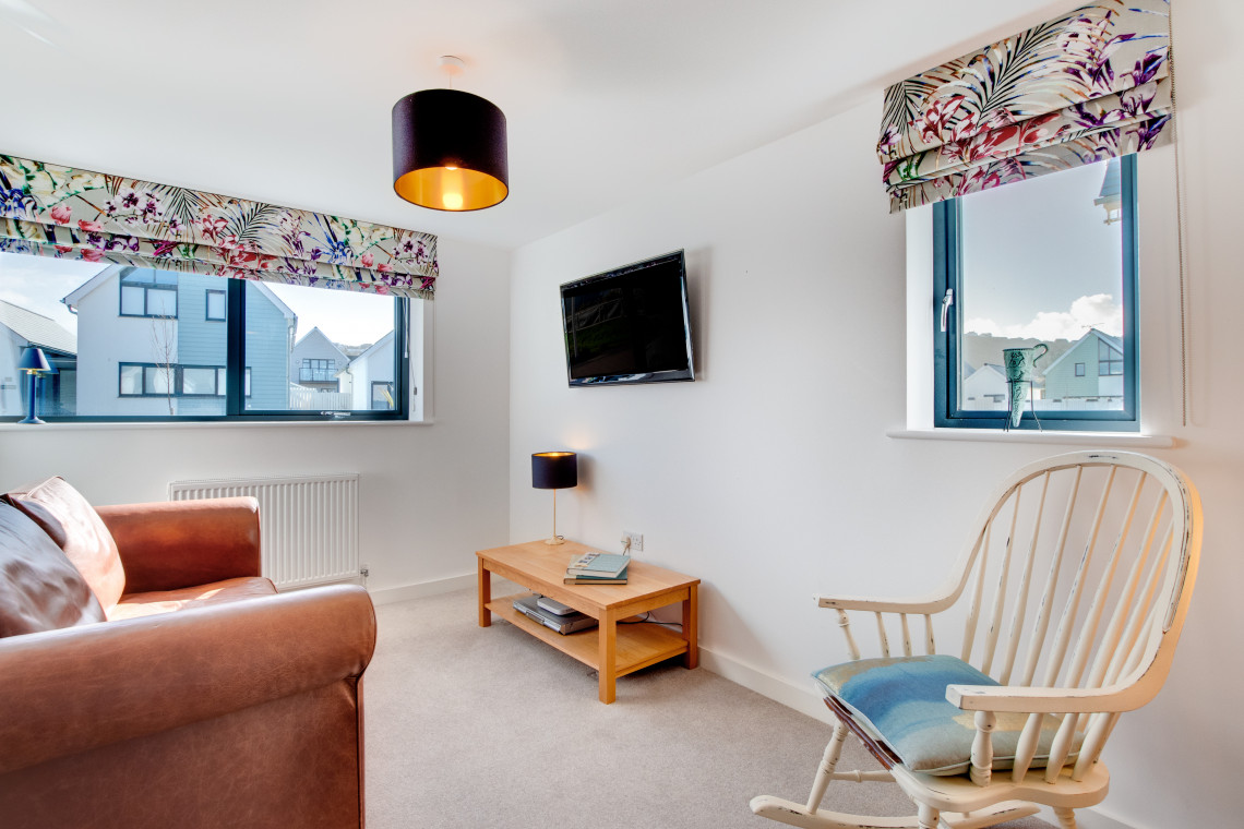 - Rooms: 3 bedrooms, 2 en suites with shower, washbasin, heated towel rail and WC. Snug with TV. Family bathroom with bath, shower over bath, WC, basin. Kitchen/ lounge/ dining area with seating, dining table, French doors to balcony with bistro seating.