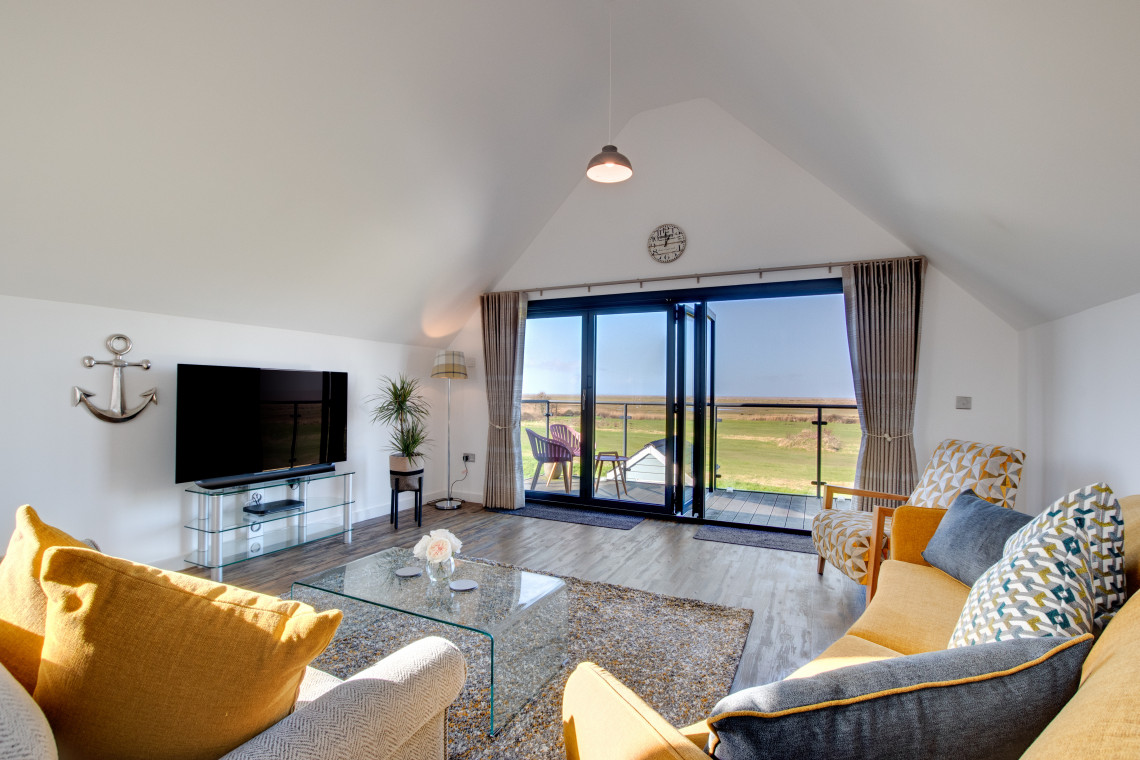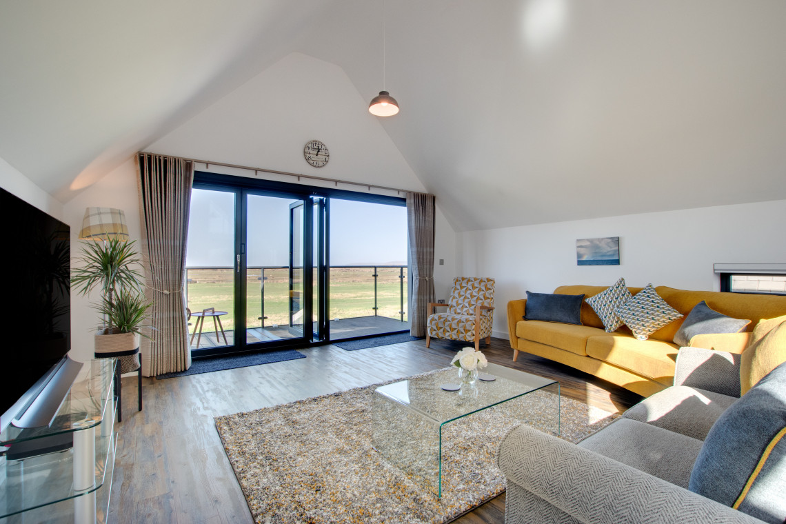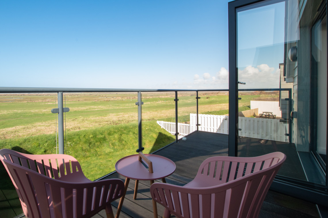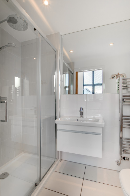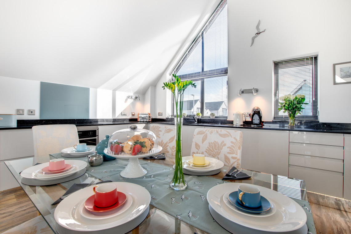 - Rooms: 3 bedrooms, 2 en suites with shower, washbasin, heated towel rail and WC. Snug with TV. Family bathroom with bath, shower over bath, WC, basin. Kitchen/ lounge/ dining area with seating, dining table, French doors to balcony with bistro seating.