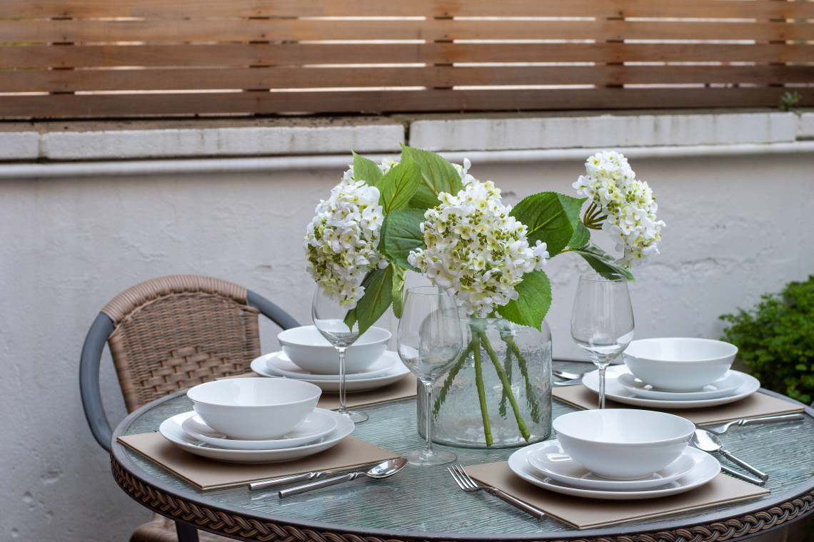 Outdoors: Enclosed patio with outside seating.
