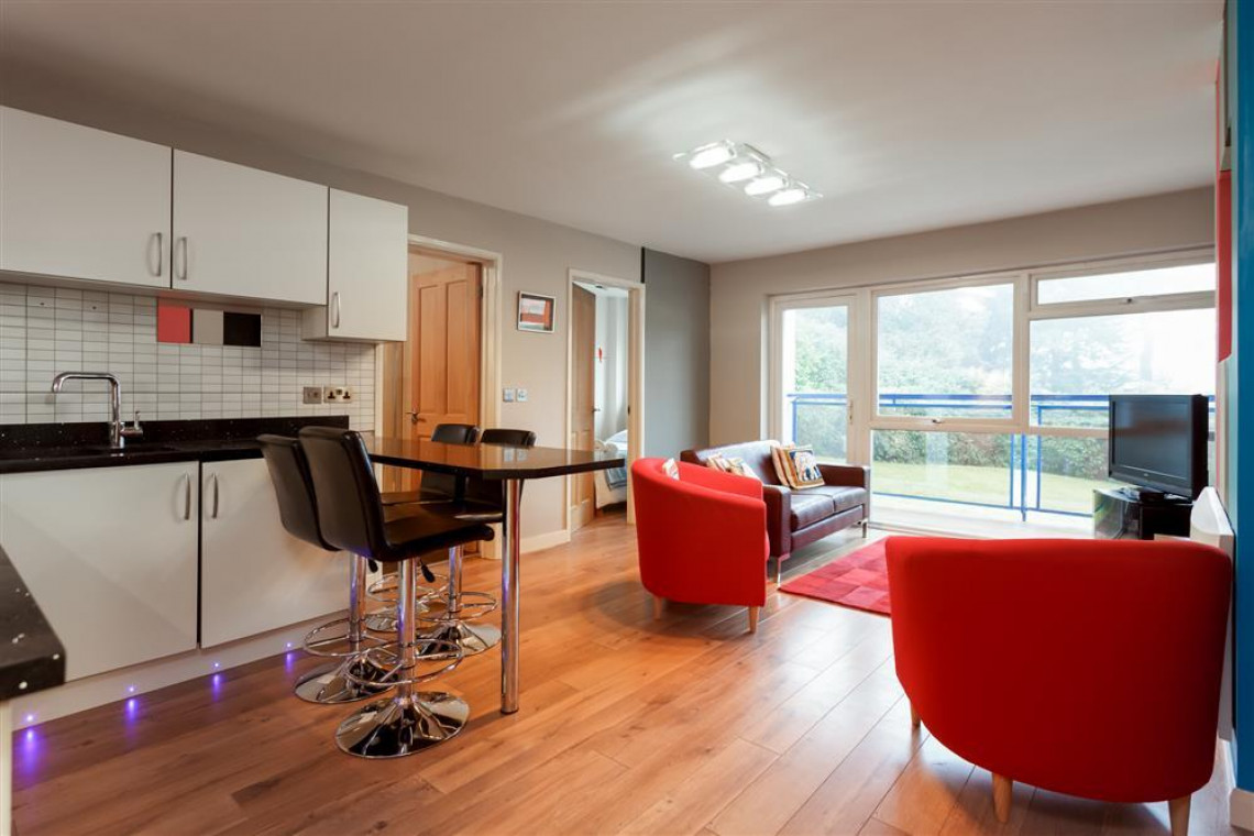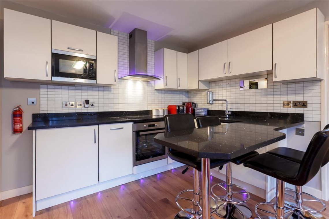 The entrance hall leads to an open plan living area with patio doors and a balcony which overlooks the secluded communal gardens. The kitchen is of a high specification with integrated appliances including a dishwasher, washer dryer and microwave and the breakfast bar has seating for four.