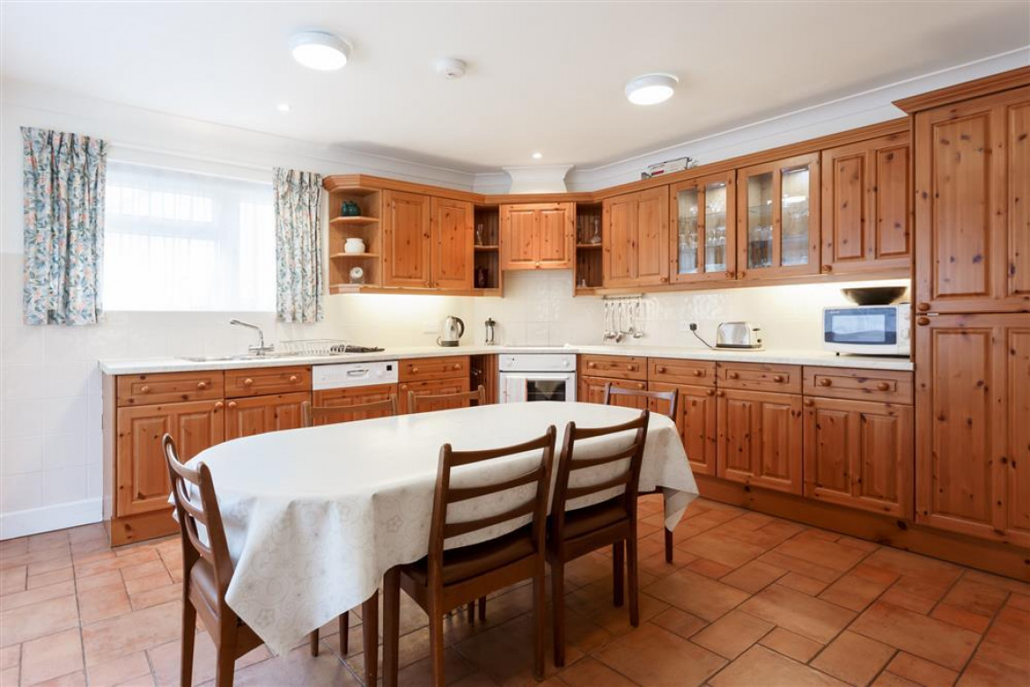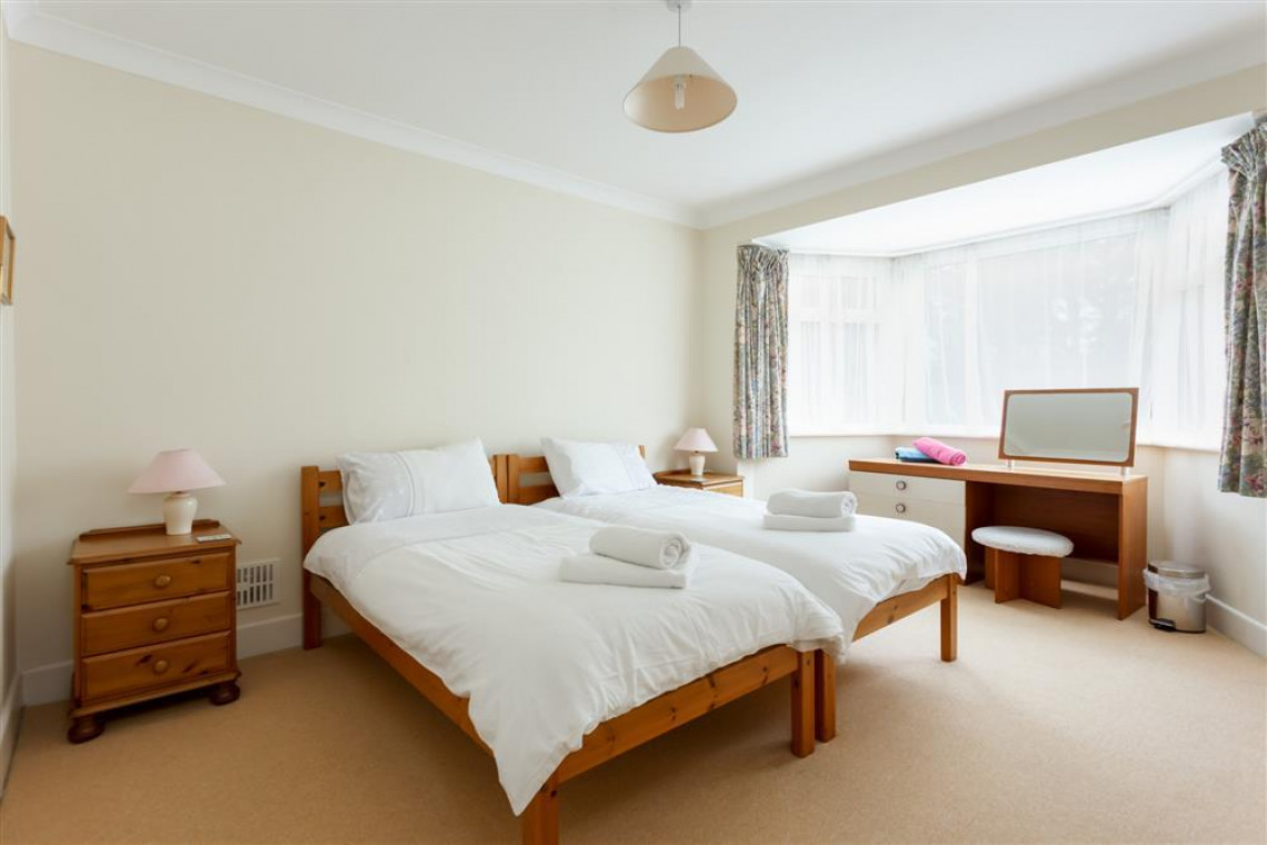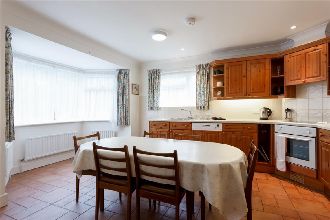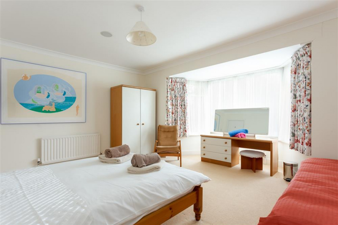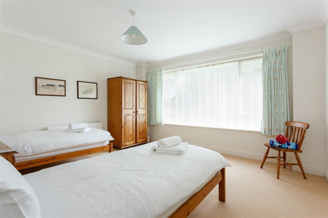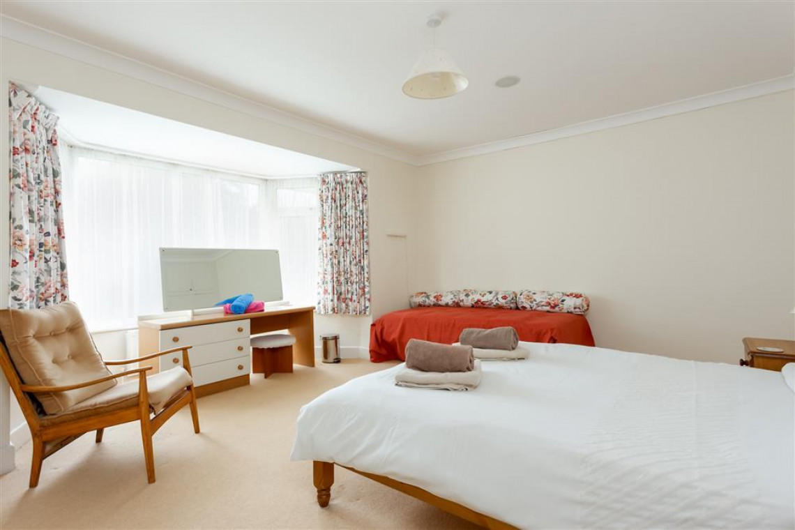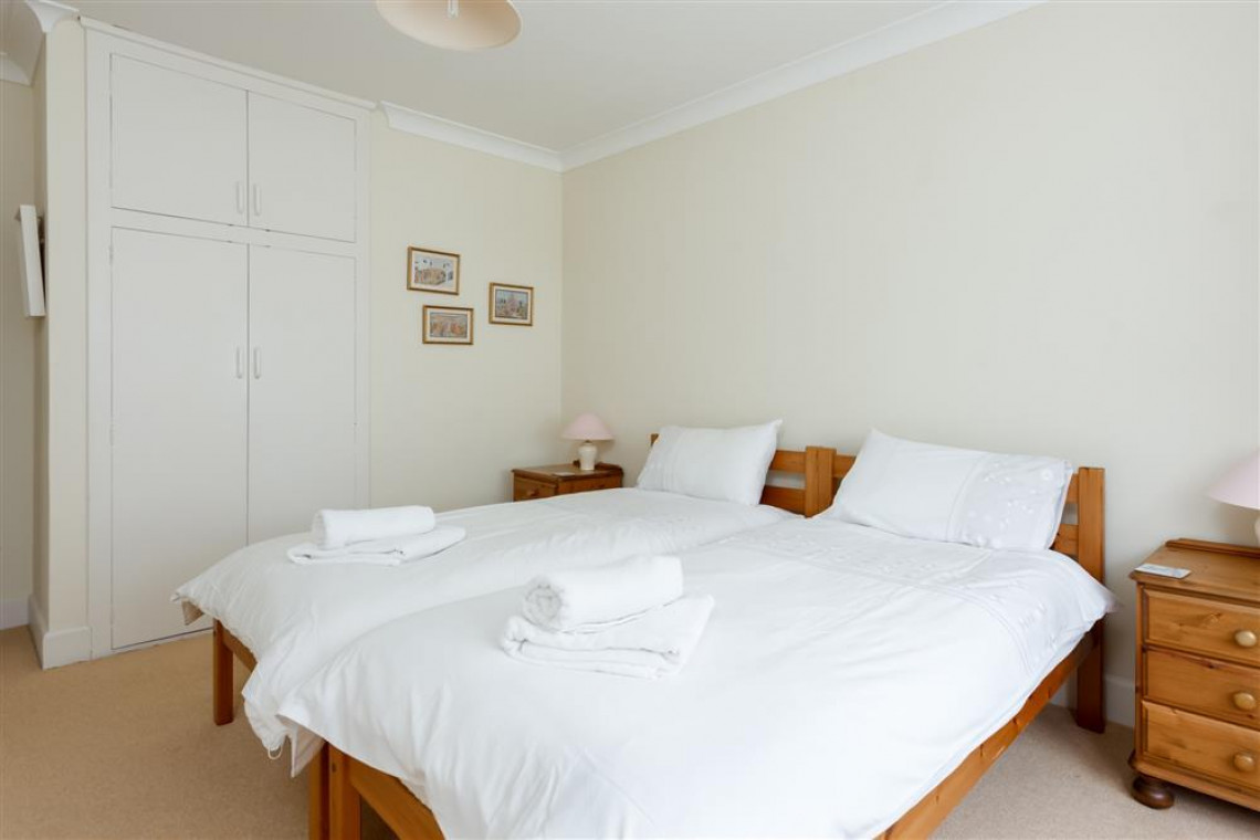 The spacious flat is on the first floor with access to two large gardens and garden furniture. The apartment has three large bedrooms and sleeps 6 people. To the front of the property is a mature, ornamental garden and at the rear, there is a lawn garden and a large patio area which is a spacious sun-trap with available garden tables and chairs in locked storage. There is a locked garage for cycles and sports equipment.