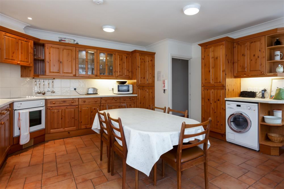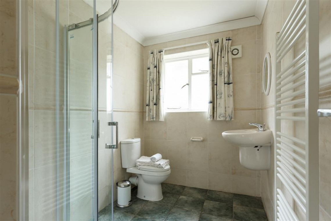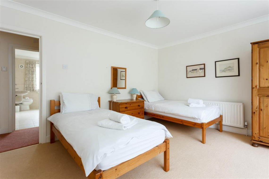 The entrance door, which is at the back of the building, leads to a staircase up to the first floor. The hallway then leads to a lounge with TV which overlooks the front garden. The kitchen is spacious and well equipped with a large fridge freezer and a dishwasher and a dining area that comfortably seats six people. At the other end of the hall, there is a master double room and two further twin bedrooms. The large family bathroom has a bath with a hand shower, toilet and basin. There is also a separate shower room with toilet and basin.