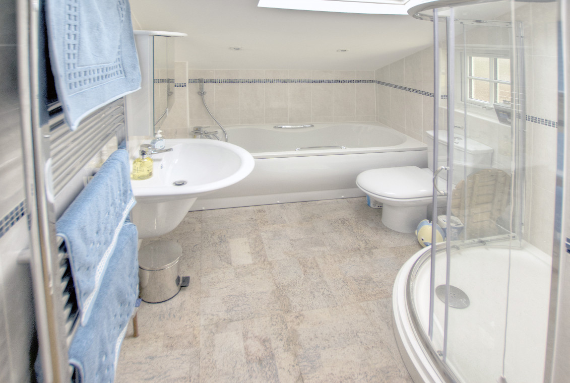 Bathroom: Shower cubicle, bath with hand shower, basin, WC.