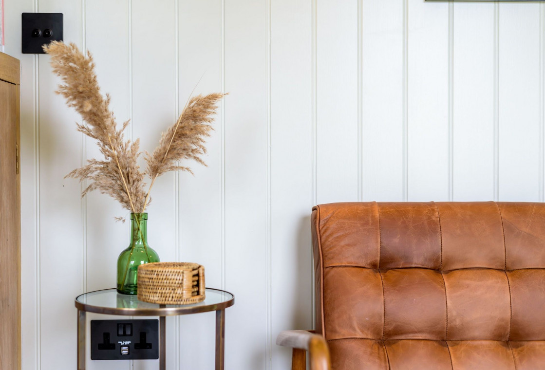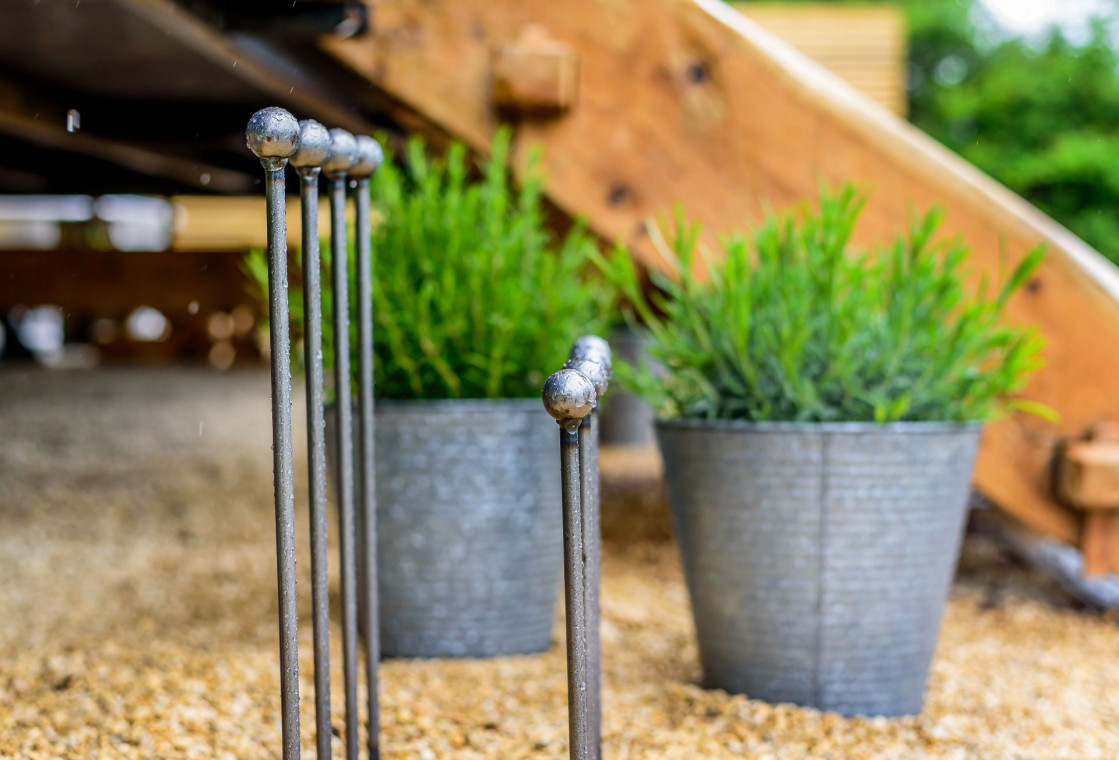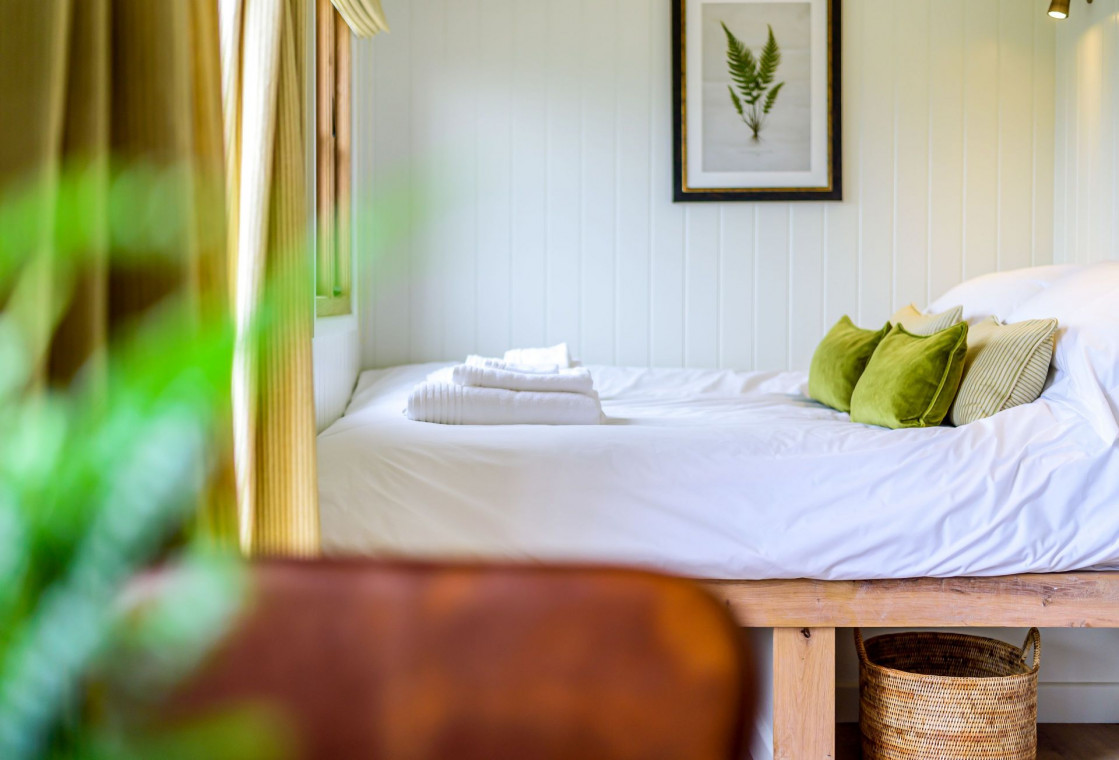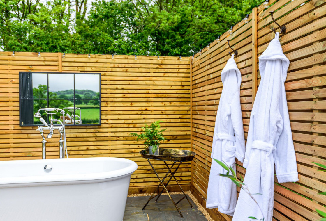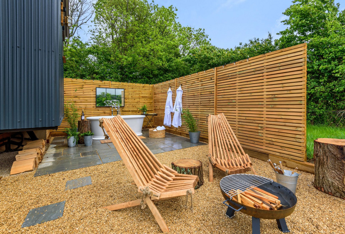 Step up and enter Hintock through the french doors where you will be greeted by a lovely open-plan living space. To the left is a king-size bed with Egyptian cotton bedding and fantastic views over the rolling Dorset landscape, with plenty of storage space underneath. Opposite the french doors is a comfy leather sofa with the kitchen space on the right. The kitchen is well-equipped with an oven, electric hob, fridge freezer and sink - everything you need to cook up a storm after a days exploring. There is a table and chairs for two, again, with stunning views through the window above. The en-suite is through a door at the end of the hut, and is home to a shower, wash basin and WC. Outside you are treated to your own spa area, with a large stand alone bath tub which is privately situated on a patio; a delightful place to unwind and relax with a glass of wine overlooking the surrounding fields. Bespoke wooden deck chairs surround the firepit, which can also be used as a barbecue for cooking al fresco. There is also a bistro seating area which is great for a morning coffee.