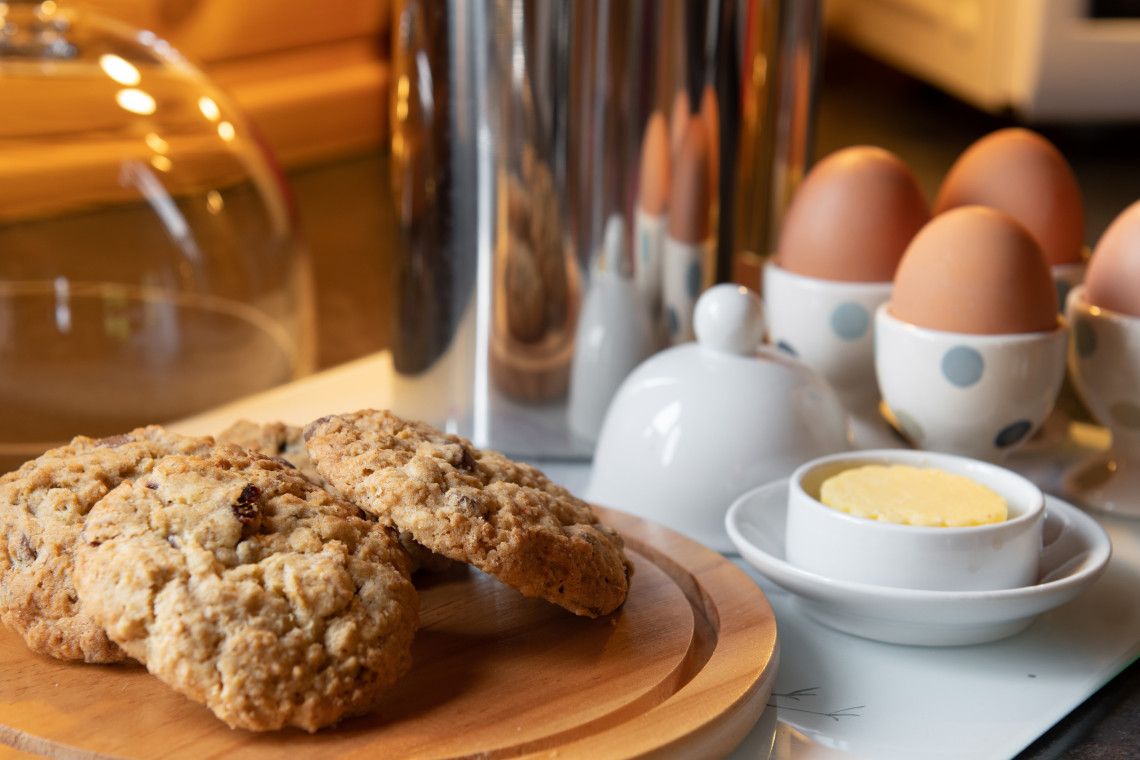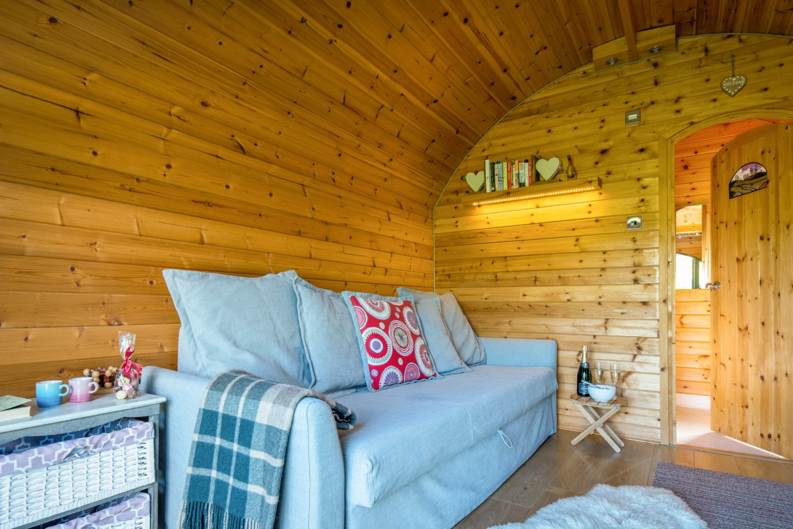The welcome basket was a lovely touch, including a freshly baked loaf of bread, some Peak District dairy milk, eggs, Fair Trade tea, coffee, sugar and some delicious homemade biscuits. The pod includes a kitchenette with all the utensils you’d ever need, a small fridge with a little freezer space, central heating and warm water, hanging space and coat hangers, outdoor deck chairs and picnic table, a firepit and barbecue, hosepipe for washing muddy paws, a king size pull-out sofa bed and an en-suite shower with a heated towel rail.