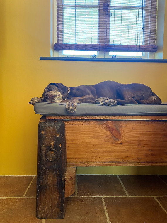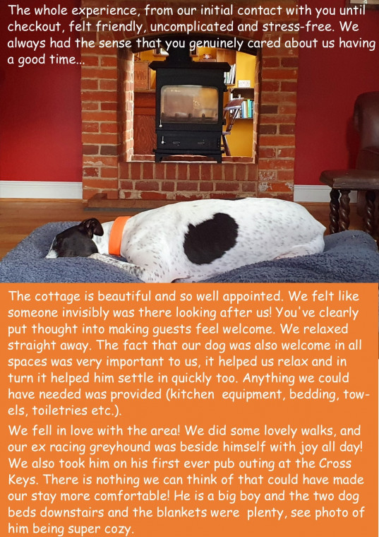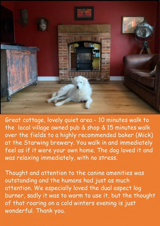 For us the rural village location, the many walks and local pubs made this a perfect relaxing staycation. Lets be clear, though, the star attraction here is the cottage itself. It has a warmth and generosity to it that is not just from the log burner, the richly painted walls, or the cosy underfloor heating. Perhaps it’s the contented energy of the many happy dogs and humans that have lived and stayed here before. We loved it and agreed with a previous guest’s feedback that they can’t imagine another dog friendly cottage trumping this one.High praise from us and, of course, from Woody, currently lazing in front of the log burner with pink squeaky pig from the chest of delights. One very happy hound.