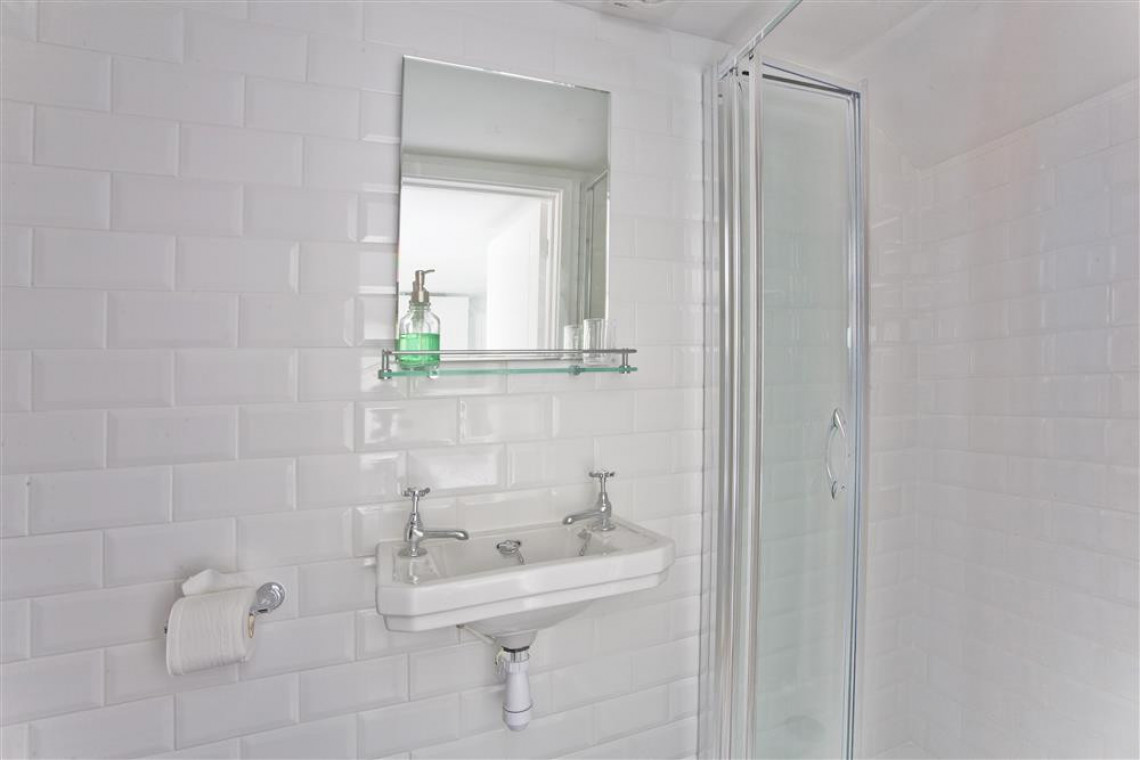 Ensuite shower room: shower cubicle, hand basin, heated towel rail, WC.