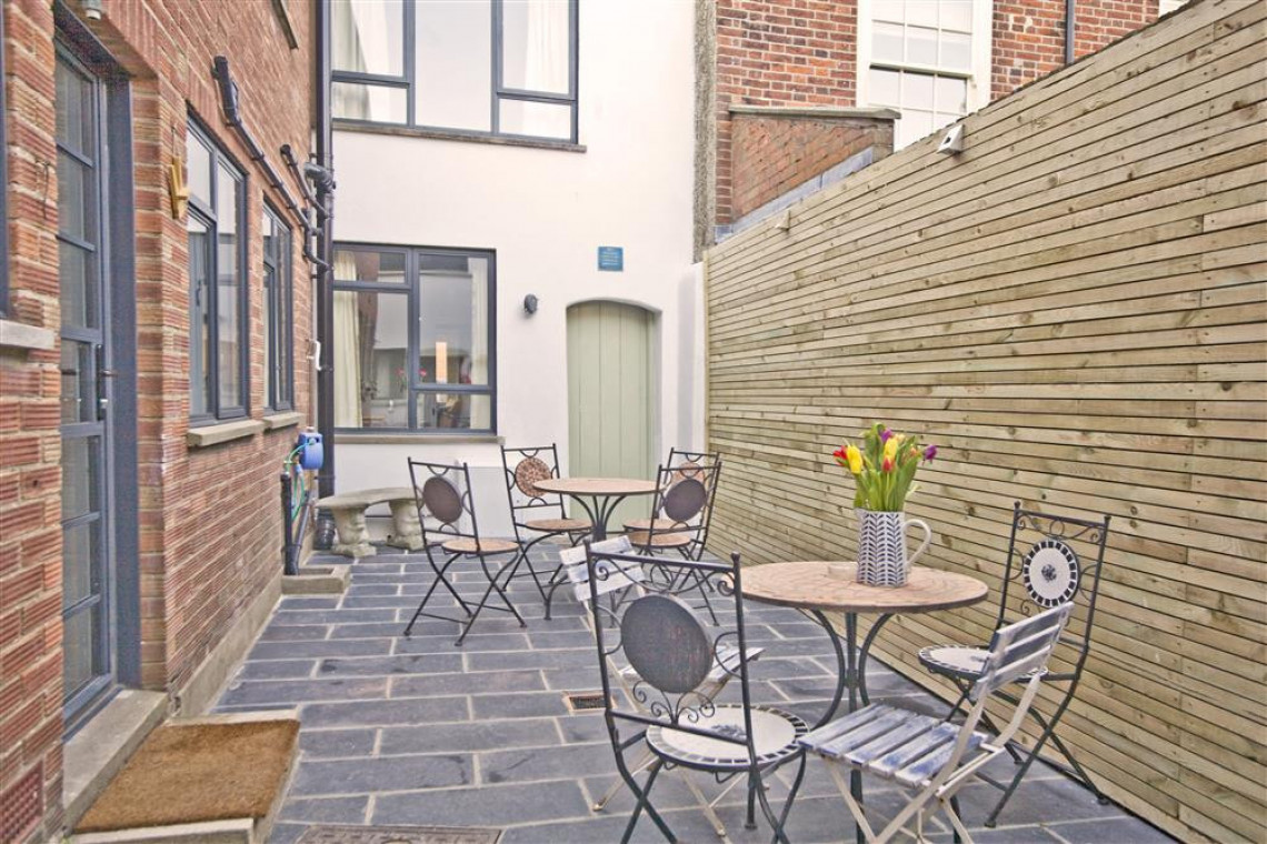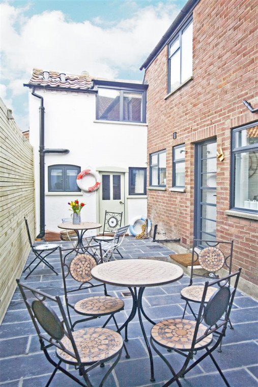Outside: paved courtyard garden with door to front of the cottage via the covered passageway, table and chairs.