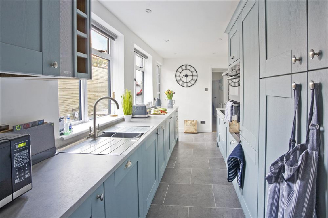 Kitchen: galley style kitchen. Dishwasher, microwave, integrated fridge/freezer, Aeg electric double oven and grill, Aeg induction hob with extractor hood, kickboard heating.