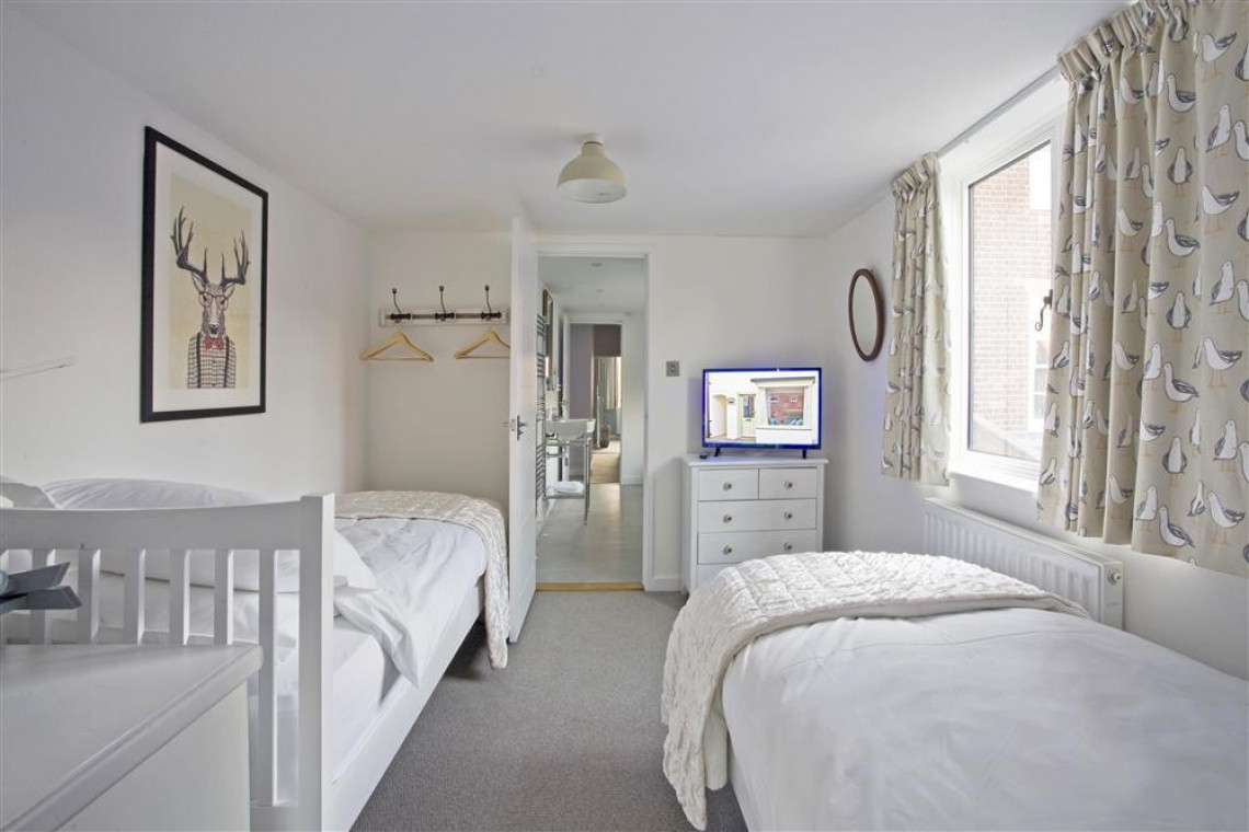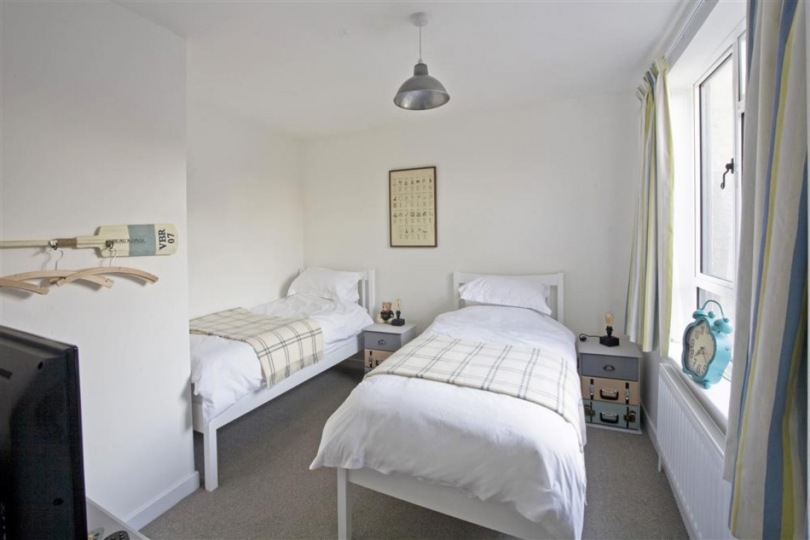 Bedroom 3: twin beds, chest of drawers, bedside tables, lamps. Sky Q TV with Netflix,