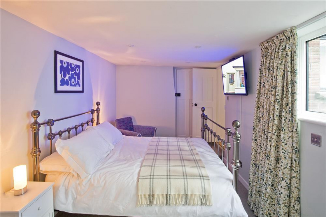 Bedroom 1: double bed, built in wardrobe, bedside tables, lamps, wall mounted Sky Q TV with Netflix, half glazed door to courtyard (two shallow steps from the hall into this bedroom)