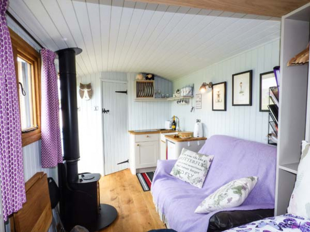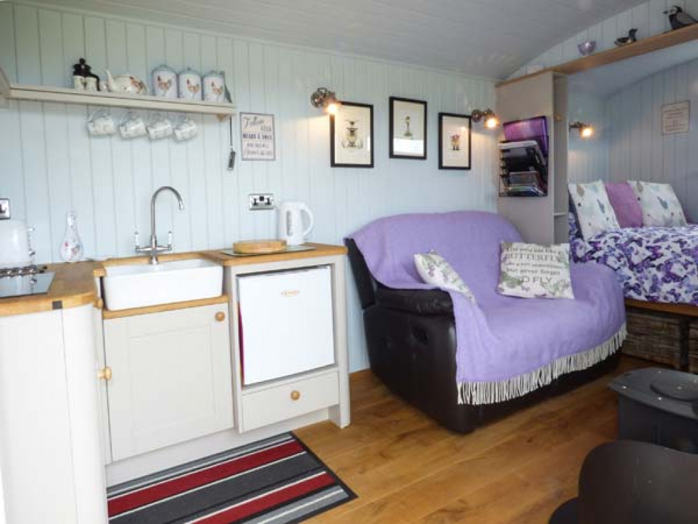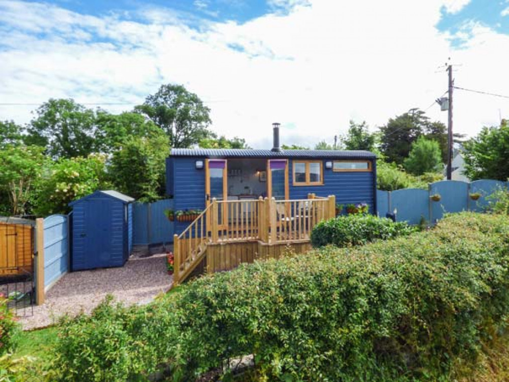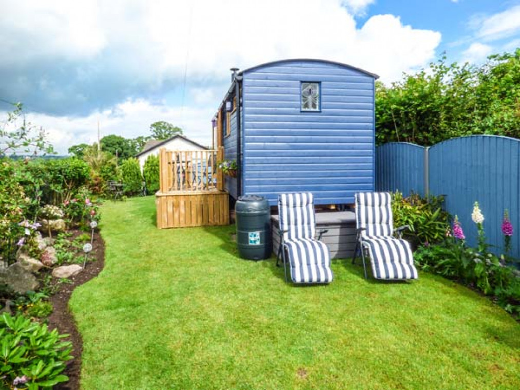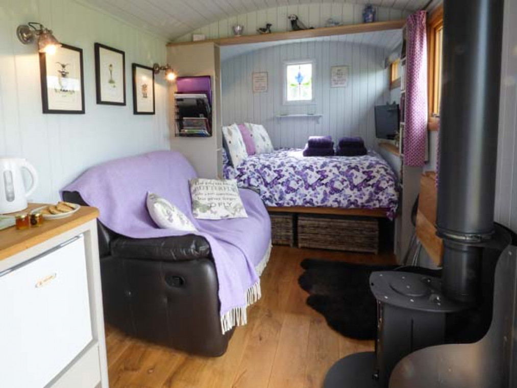 Ruthin 3.5 miles. This hand-crafted, wooden shepherd’s hut is situated amidst wonderful countryside and far-reaching views in the rural hamlet of Llanynys, less than 4 miles from Ruthin. Offering the perfect hideaway for summer and winter breaks, this immaculately-presented property is located next to the owners’ home and offers quality, open plan studio accommodation with attention to detail. Step inside to discover a comfy double bed, a sitting room with a reclining sofa and a dining table and a woodburning stove, as well as a well-equipped kitchenette and a separate shower room. Double French doors open onto the elevated decked patio which looks over the countryside towards Snowdonia, providing an excellent place to enjoy a morning coffee whilst planning an exciting outing for the day. The enclosed gardens are beautifully maintained, and offer seating spots to enjoy the sun and listen to the bird song throughout the day, with a bistro table on the lawn, sun loungers, as well as an inviting swing seat to relax into with a good book. There is a separate heated drying hut for boots and clothing and a secure bike store should you wish to bring mountain bikes to explore the nearby tracks in Llandegla, or enjoy the cycle route on the country lane running past. The popular towns of Denbigh and Ruthin are less than 5 miles away, with a wide choice of shops, bars and restaurants. The impressive peak of Moel Famau and Loggerheads Country Park can both be reached on foot, whilst Offa’s Dyke and the Clwydian Way trails pass within 3 miles of the door. This pretty, chocolate-box, shepherd’s hut is an ideal romantic retreat for a couple looking for a peaceful getaway from which to explore this gorgeous part of North Wales. All ground floor. Open plan studio accommodation with double bed, kitchenette, sitting area with drop-leaf dining table and woodburning stove. Shower room with shower, basin and WC. Amenities for Rental Oil-filled portable electric heater with woodburning stove Electric ceramic 2-ring hob, microwave, fridge, Smart TV with Freeview, DVD, WiFi, selection of books and DVDs Fuel, power and wood for stove inc. in rent Bed linen and towels inc. in rent Off road parking for 1 car on shared drive Drying hut including wine/drinks cooler and bike store inc Enclosed lawned garden with furniture, swing seat and BBQ Decked patio with bistro table Two well-behaved dogs welcome Sorry, no smoking Shop and pub 1 mile Note: Double bed is in open plan living space and accessed from one side only Note: Access is up 5 external steps Note: Please keep dogs on a lead due to owner's cat.