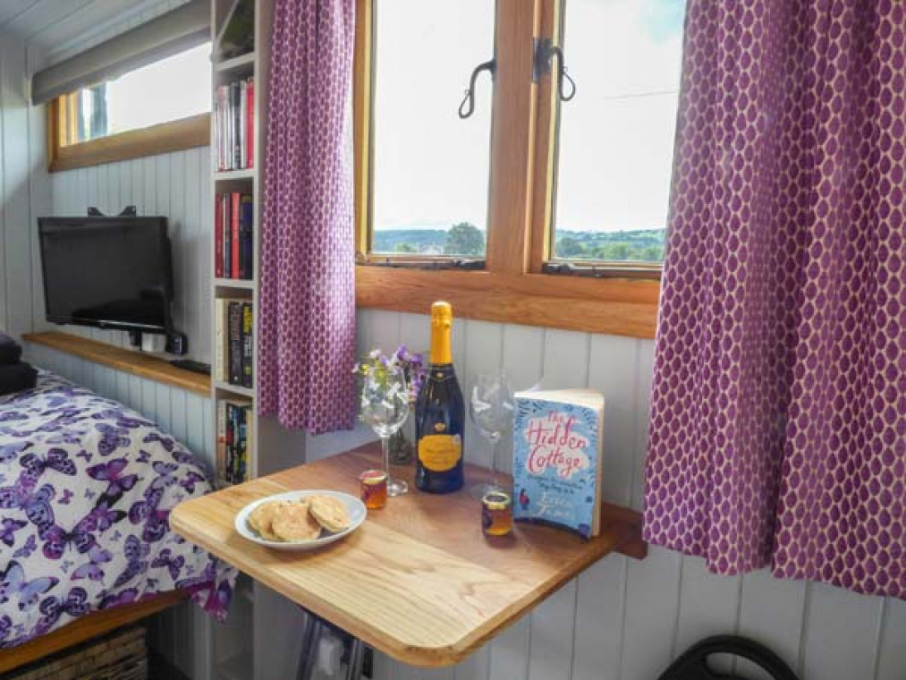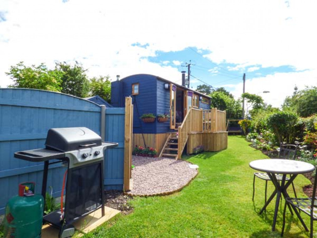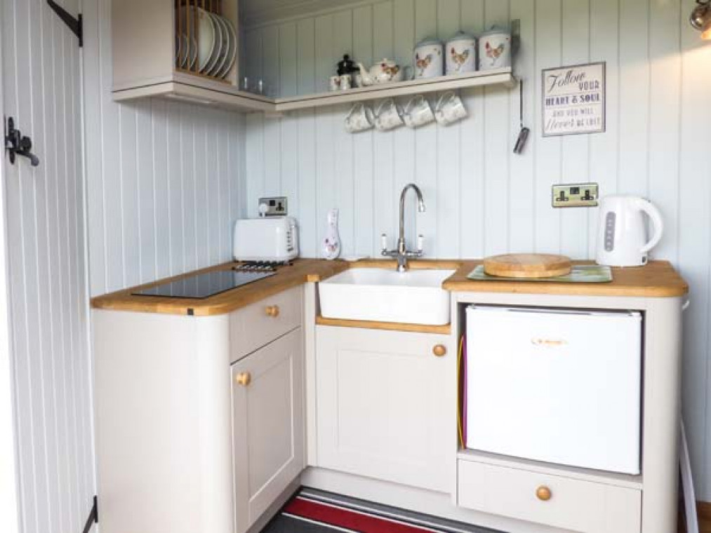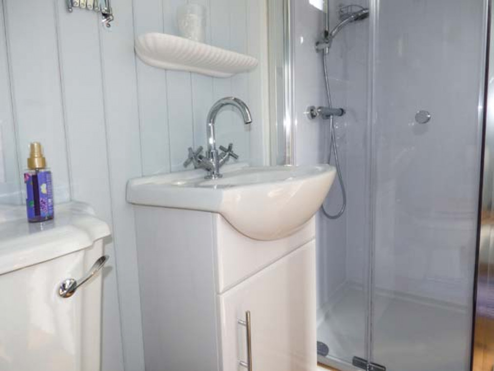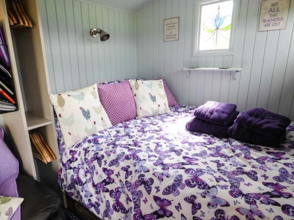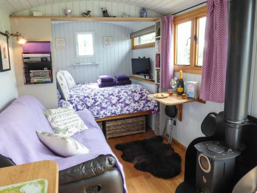 Ruthin 3.5 miles. This hand-crafted, wooden shepherd’s hut is situated amidst wonderful countryside and far-reaching views in the rural hamlet of Llanynys, less than 4 miles from Ruthin. Offering the perfect hideaway for summer and winter breaks, this immaculately-presented property is located next to the owners’ home and offers quality, open plan studio accommodation with attention to detail. Step inside to discover a comfy double bed, a sitting room with a reclining sofa and a dining table and a woodburning stove, as well as a well-equipped kitchenette and a separate shower room. Double French doors open onto the elevated decked patio which looks over the countryside towards Snowdonia, providing an excellent place to enjoy a morning coffee whilst planning an exciting outing for the day. The enclosed gardens are beautifully maintained, and offer seating spots to enjoy the sun and listen to the bird song throughout the day, with a bistro table on the lawn, sun loungers, as well as an inviting swing seat to relax into with a good book. There is a separate heated drying hut for boots and clothing and a secure bike store should you wish to bring mountain bikes to explore the nearby tracks in Llandegla, or enjoy the cycle route on the country lane running past. The popular towns of Denbigh and Ruthin are less than 5 miles away, with a wide choice of shops, bars and restaurants. The impressive peak of Moel Famau and Loggerheads Country Park can both be reached on foot, whilst Offa’s Dyke and the Clwydian Way trails pass within 3 miles of the door. This pretty, chocolate-box, shepherd’s hut is an ideal romantic retreat for a couple looking for a peaceful getaway from which to explore this gorgeous part of North Wales. All ground floor. Open plan studio accommodation with double bed, kitchenette, sitting area with drop-leaf dining table and woodburning stove. Shower room with shower, basin and WC. Amenities for Rental Oil-filled portable electric heater with woodburning stove Electric ceramic 2-ring hob, microwave, fridge, Smart TV with Freeview, DVD, WiFi, selection of books and DVDs Fuel, power and wood for stove inc. in rent Bed linen and towels inc. in rent Off road parking for 1 car on shared drive Drying hut including wine/drinks cooler and bike store inc Enclosed lawned garden with furniture, swing seat and BBQ Decked patio with bistro table Two well-behaved dogs welcome Sorry, no smoking Shop and pub 1 mile Note: Double bed is in open plan living space and accessed from one side only Note: Access is up 5 external steps Note: Please keep dogs on a lead due to owner's cat.