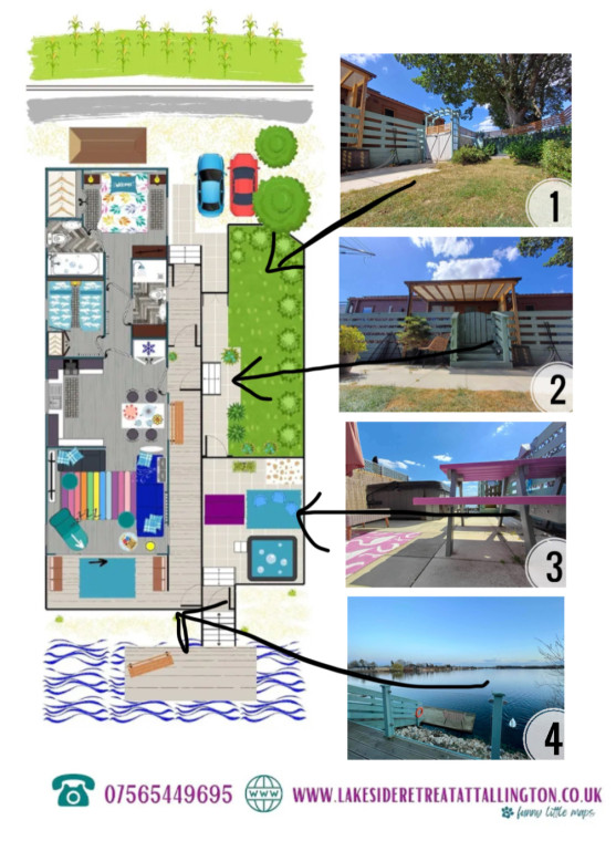Off road parking for 2 cars is right next to the lodge. Head up 4 steps onto the wraparound verandah, and onto the decking where you can appreciate the huge Lincolnshire sky and the vast lake. Right outside the lodge door is a gate to the garden, which is mainly grass. Pass through a second gate and you will enter the lower patio, which has a picnic bench and a hot tub overlooking the lake. Both areas have access to the jetty, via gates. The gates ensure a flexible and safe environment for anyone visiting with dogs or children. The jetty may be used for fishing, or you can launch your own kayaks or paddle boards from here (ask for details). Please note dogs are not allowed in the lake. There are plenty of walks in the lodge information folder that are suited to watery fun.