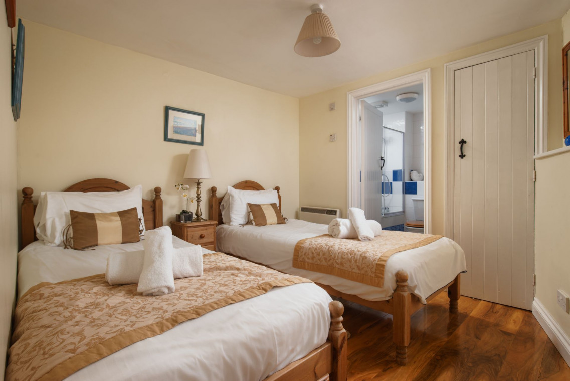 Both the twin bedroom and the double have en-suite bathrooms. Outside, there’s a fully enclosed garden for privacy, with a patio and a barbecue area.